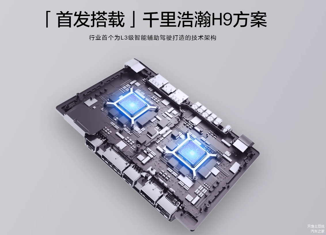 行业首个为L3级辅助驾驶的千里浩瀚H9方案,自研自制算力高达1400TOPS的双Thor芯片,5激光雷达(1颗长距和4颗补盲)。