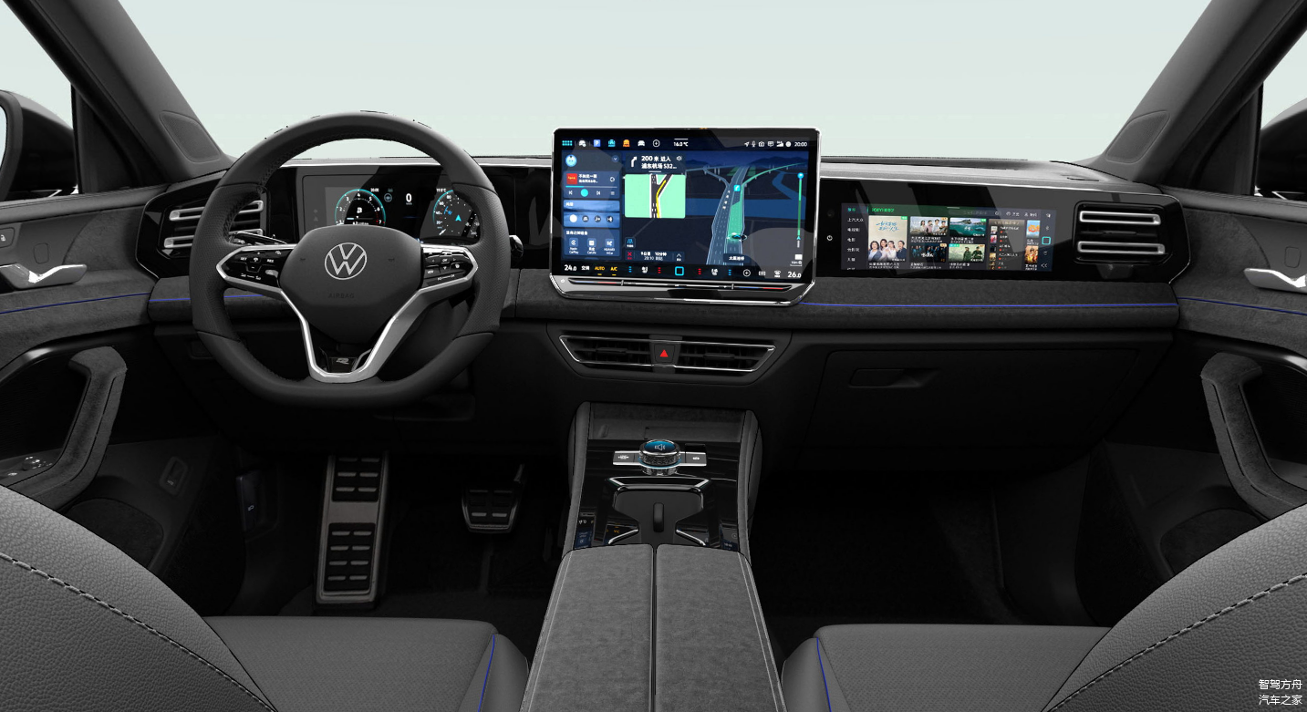 内饰方面,三幅式多功能方向盘,中控台配备10.3英寸数字液晶仪表盘,搭配全新的 12.9英寸/15英寸悬浮式Pad屏+副驾驶触屏的设计布局。中央则是搭载了与ID.7 VIZZION极其相似的15英寸悬浮式中控屏。新车还采用了电子怀挡,座舱科技感十足。还配备抬头显示系统、全景影像、15W手机无线充电、三温区自动空调、后流水式转向灯等。