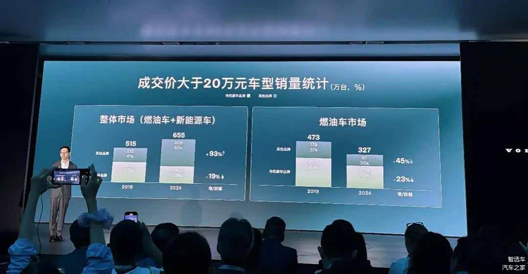 现场展示了一张图表,成交价20万以上的车型销量,对比2019年和2024年,整体市场(燃油车+新能源车)还是增长的。其中,传统豪华品牌的市占率,却从59%下滑到了38%。