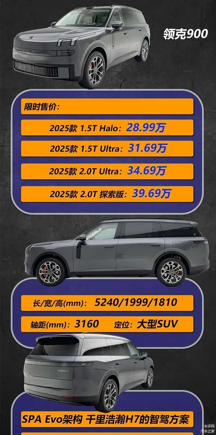 2025年4月28日,领克品牌正式推出旗下全新旗舰大型SUV领克900。此次上市共推出4款配置车型,官方指导价区间为30.99-41.69万元,同时推出限时优惠价28.99-39.69万元。新车基于SPA Evo大型电混车专属架构打造,提供1.5T和2.0T两种混动动力选择。