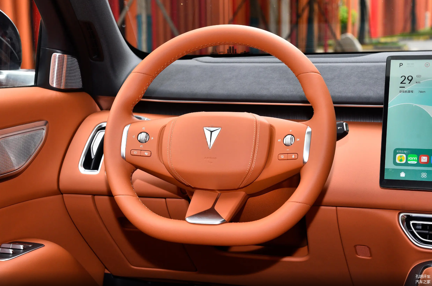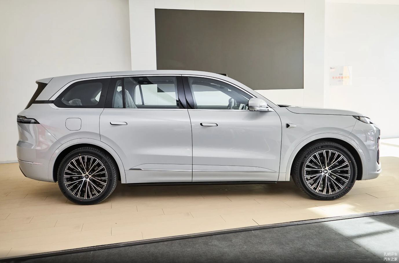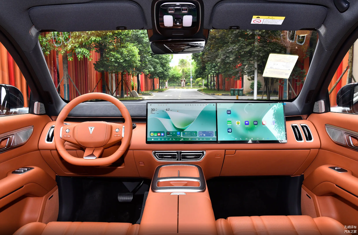 打开车门之后会有点熟悉的感觉,尤其整个中控台面的风格和理想L系列是非常接近的,整个中控车机大屏幕继续向右侧延伸出了同等尺寸的副驾驶娱乐大电视,而且在这个级别直接选择了华为的鸿蒙os车机系统,整体的智能化生态表现是比较出色的。