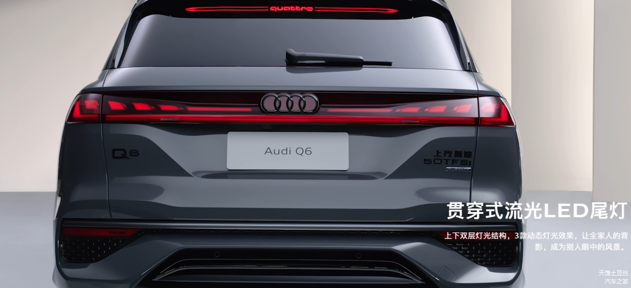 说奥迪,不提“灯厂”的大名怎么行?贯穿式LED尾灯采用上下双层结构,逐渐点亮的流光动态效果,仪式感满满;大名鼎鼎的夸戳“quattro”警示灯身居高位,成功人士座驾的情绪价值直接拉满,你潇洒离去的背影,就是别人眼中艳羡的风景。