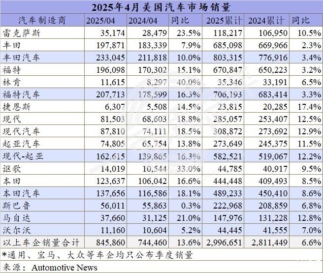 GlobalData统计的初步数据显示,4月美国轻型车(包含轿车、SUV、MPV和皮卡)新车销量同比增长13%至149万辆。