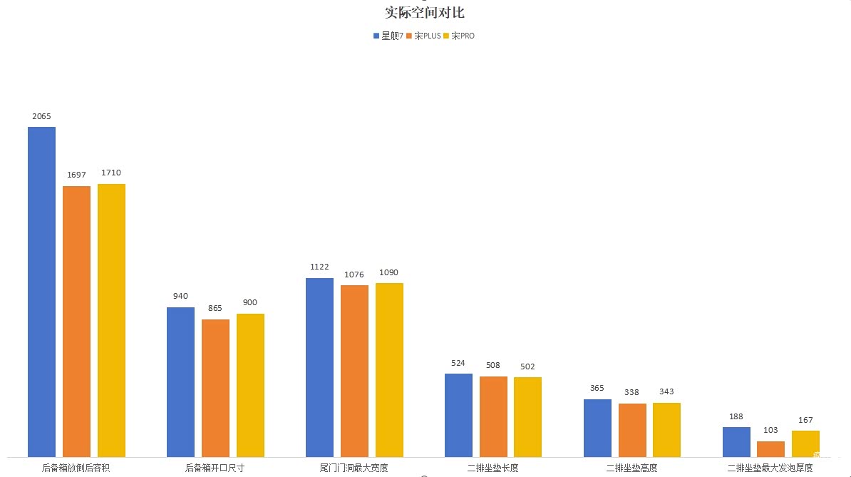作为家庭用车来说,除了以上我们所对比的项目以外,空间也是每个家庭用户都关心的问题。星舰7的长宽高分别为4740×1905×1685毫米,轴距为2755毫米。而宋Pro长宽高分别为4735×1860×1710毫米,轴距为2712毫米。虽然从车身三围数据来看,星舰7对比宋Pro并没有太大的优势。