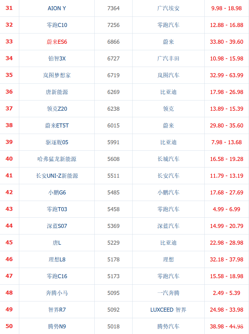 第八名是Model Y,属于经典车型,凭借出色的产品力深受高端消费者的青睐,曾经也多次拿到月销量第一。可以看出,特斯拉在能耗方面的把控还是非常出色的。正常用车的话,很少朋友会以续航为理由吐槽,这在新能源汽车中很少见。