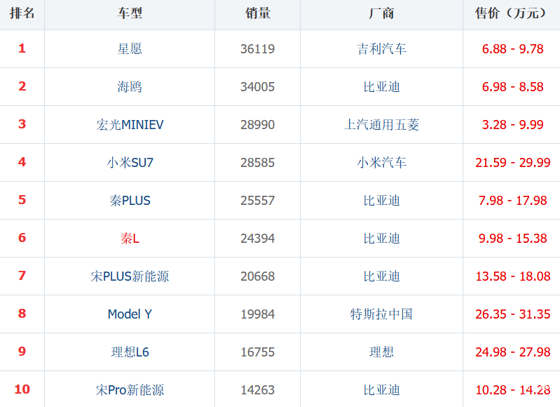 我们从销量中可以看出,前十分别为星愿、海鸥、宏光MINIEV、小米SU7、秦PLUS、秦L、宋PLUS新能源、Model Y、理想L6、宋Pro新能源。除了上海通用五菱与特斯拉之外,剩下全都是国产自主品牌。