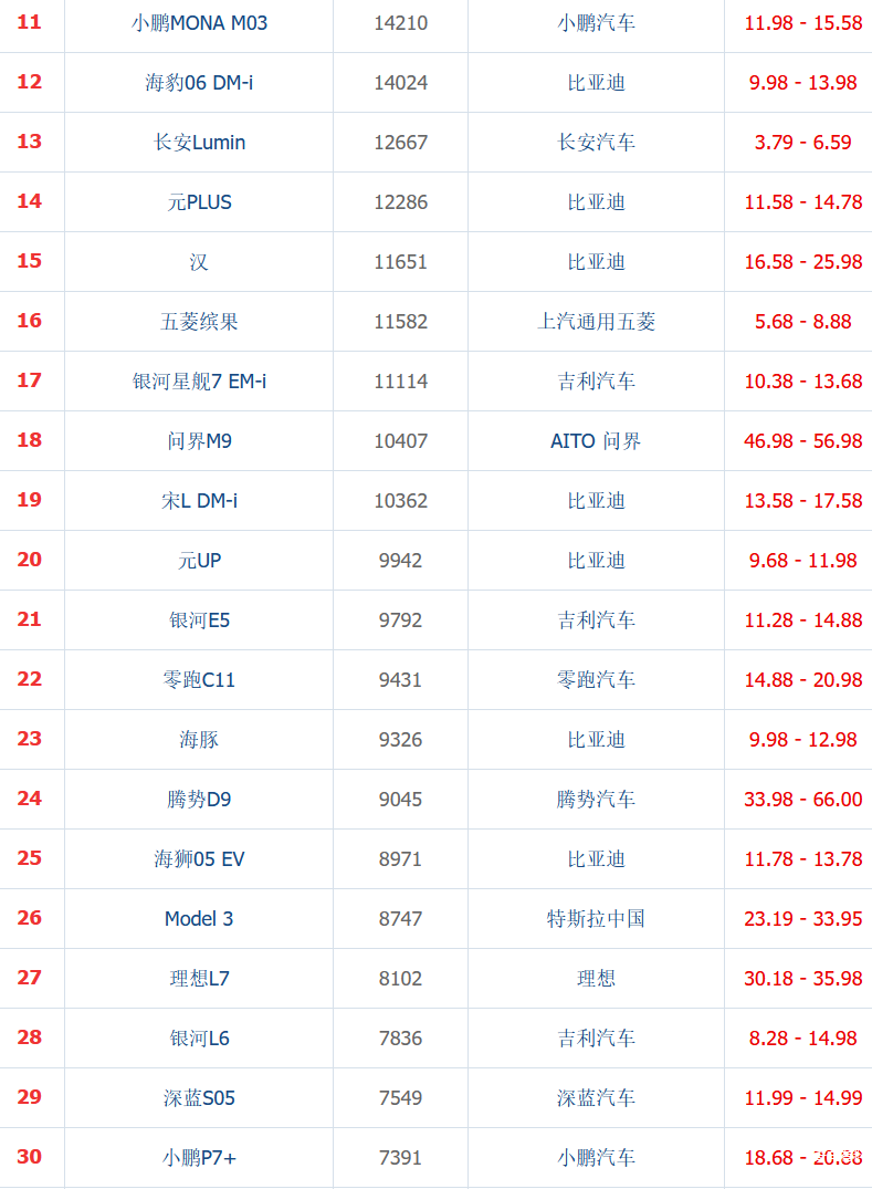 第五、六、七、十名都是比亚迪的车型,价格在10-15万左右,混动与纯电都有,空间也适合多场景,属于主流家用车。虽然市场上出现了很多对标车型,但它们的地位依然没有太大变化。一方面是因为口碑和质量的确不错,另一方面是优惠政策和增配提升了性价比。当然了,对于家用车,大家首先考虑的是稳定性,其次才是性价比。