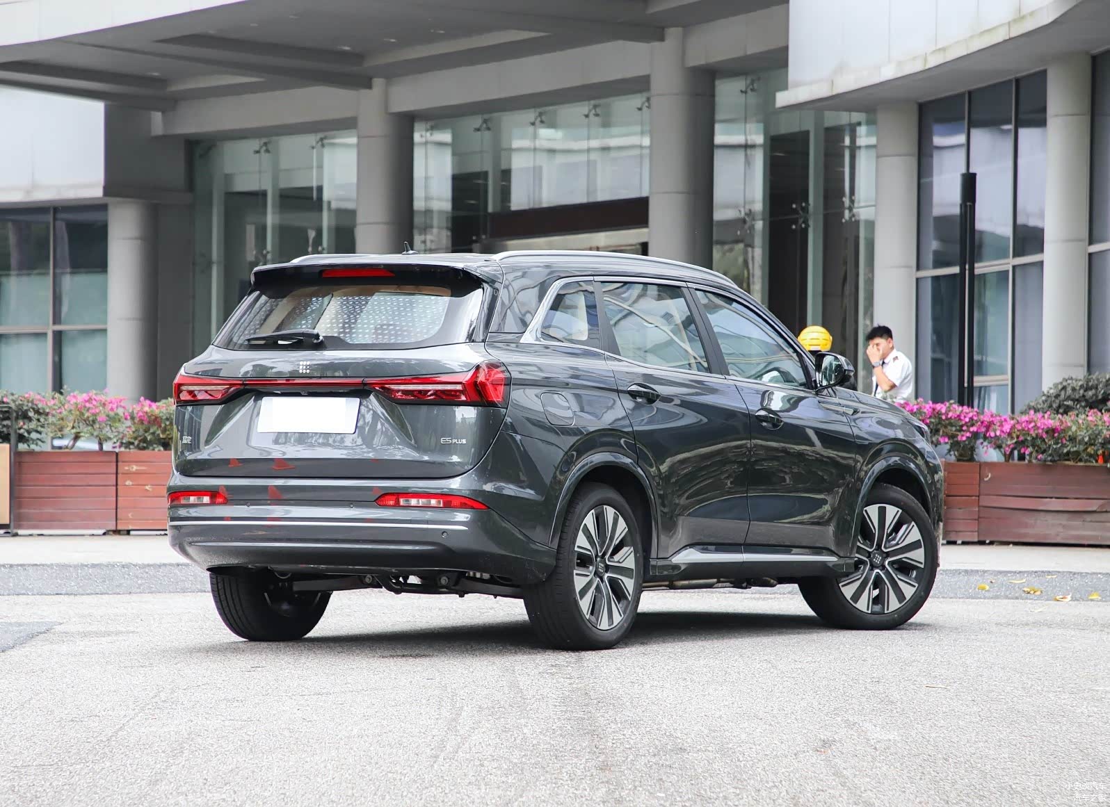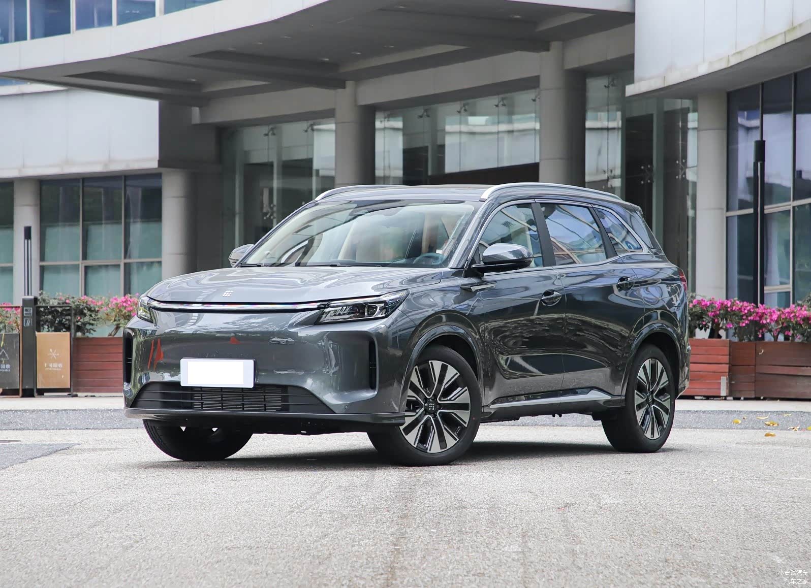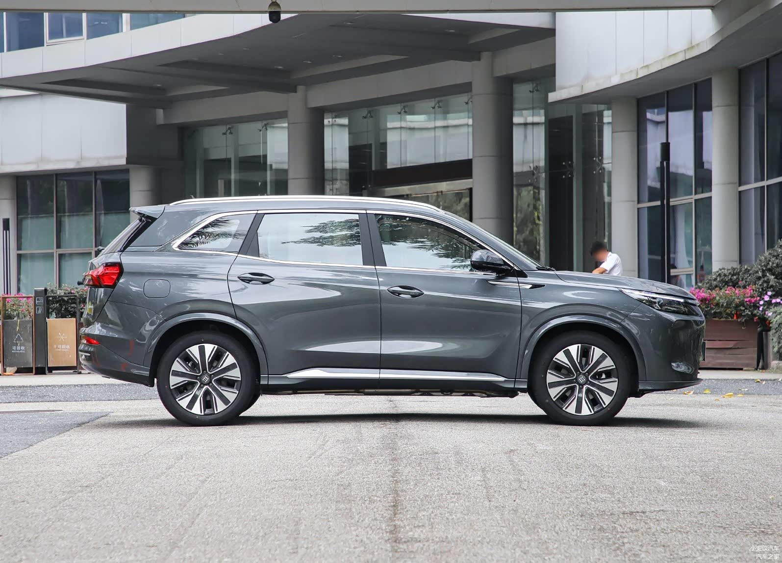 再来看新车的侧面部分,高腰线设计从前翼子板一直延伸至尾灯,营造出向前俯冲的动感姿态。车顶线条从B柱开始略微下压,形成了类似轿跑SUV的视觉效果,既保证了后排头部空间,又增添了运动感。轮毂方面,蓝电E5 Plus配备了18英寸双色铝合金轮毂,造型动感时尚,与整车风格相得益彰。车身尺寸方面,该车长宽高分别为4760/1865/1710毫米,轴距为2785毫米,定位于中型SUV,可选5座和7座布局,这样的尺寸数据在同级别车型中处于中上水平,特别是接近2.8米的轴距,为车内空间提供了坚实基础。与同价位的主流竞品相比,蓝电E5 Plus在车身长度和轴距方面都有明显优势。例如,比热销的比亚迪宋PLUS DM-i长了约60mm,轴距也长了约35mm。