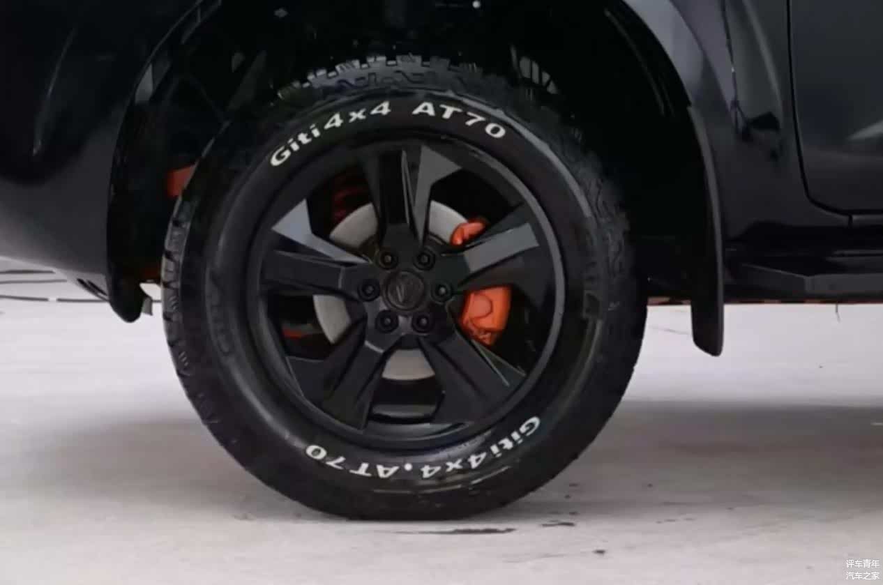 车身侧面,前后轮眉处突出的设计形成了三段式的视觉效果,而且突出的轮眉以及下方标配的佳通4x4 AT70全地形轮胎都展现出了非常不错的越野气息。车身尺寸方面也得到了进一步提升,为4894*1850*1898mm,轴距为2850mm,纵向通过角度为26度。