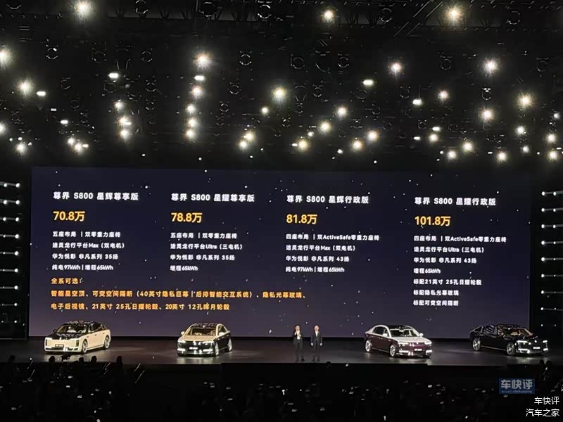 相比之前官方公布的100~150万的预售价,起售价便宜了将近30万。 应该说单从售价上来看,尊界S800确实还是给不少华为的粉丝带来了不小的惊喜。不仅入门版车型起售价整整便宜了29.2万元,即便是顶配车型还不到102万,远低于之前官方公布的150万元的最高预售价。
