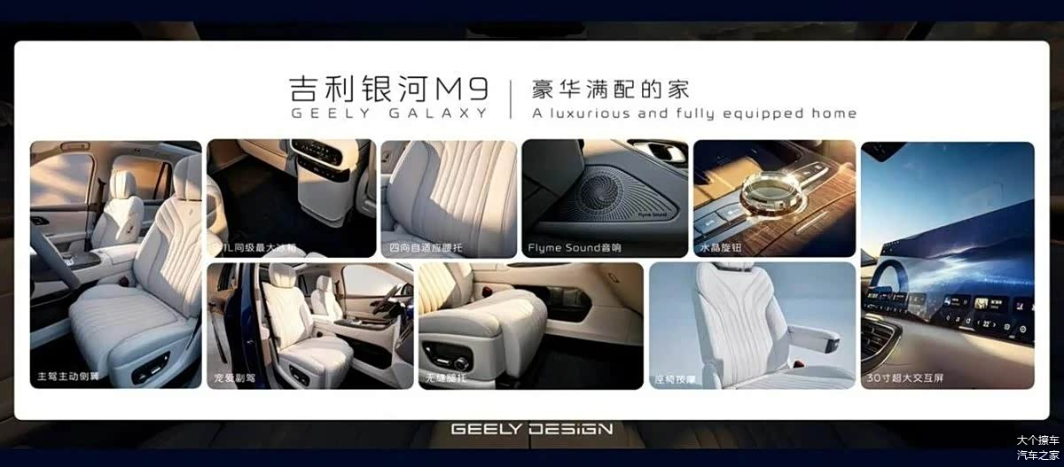 当你走进车里,银河M9的内部装潢让人不禁想到理想中的L9。除了搭载了与嵌入式小型数字仪表盘匹配的大面积抬头显示系统之外,中控台和副仪表台还配备了一块30寸的一体式悬浮贯穿屏幕,显示出极高的科技感。采用电子怀档进行方向整合,使得操作过程变得更为简便;扶手箱的前端配有水晶制成的多媒体旋钮,展现了其精湛的工艺。在座椅的设计上,主要的驾驶座配备了主动的侧翼支撑,而辅助驾驶座则配备了无缝的腿部支撑。前排座椅还配备了加热、通风、按摩以及自适应的腰部支撑功能,旨在为乘客提供一个舒适的驾驶和乘坐体验。在娱乐设备方面,配备了两排吸顶屏、Flyme Sound立体声音响系统,以及两排91L超大容量的车载冰箱,使得舱内的综合乘坐体验达到了豪华的标准。