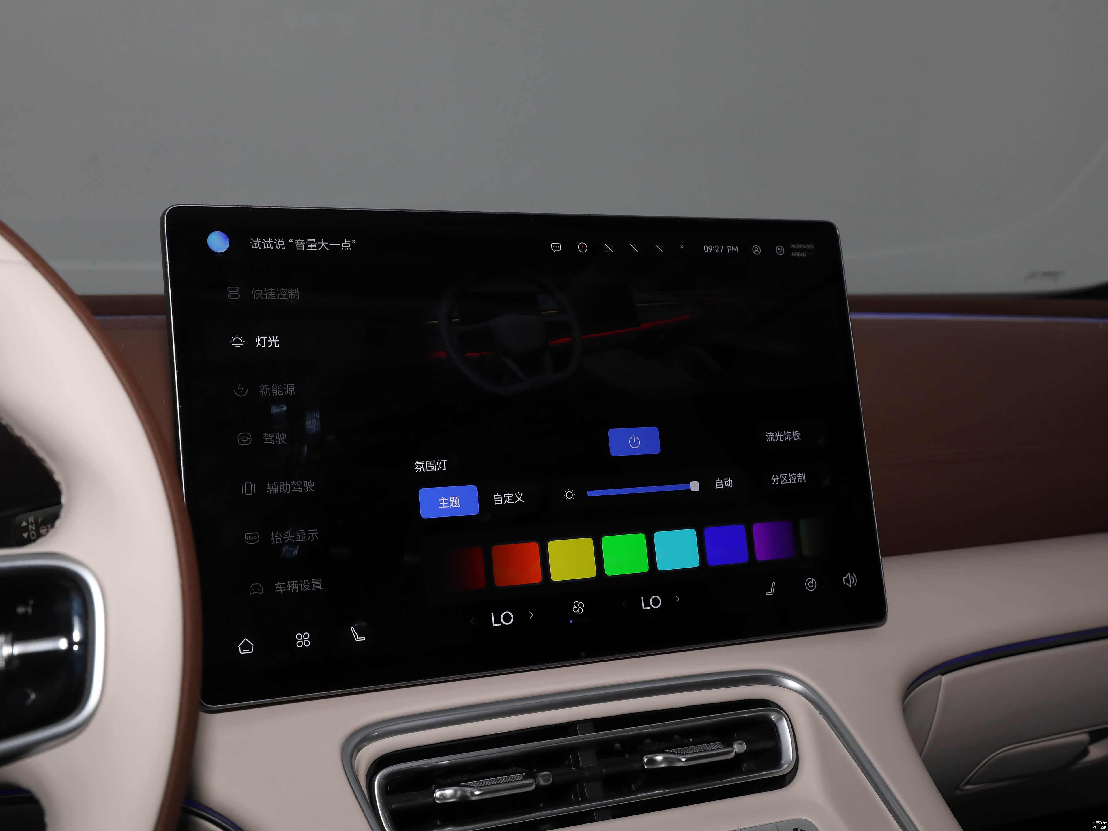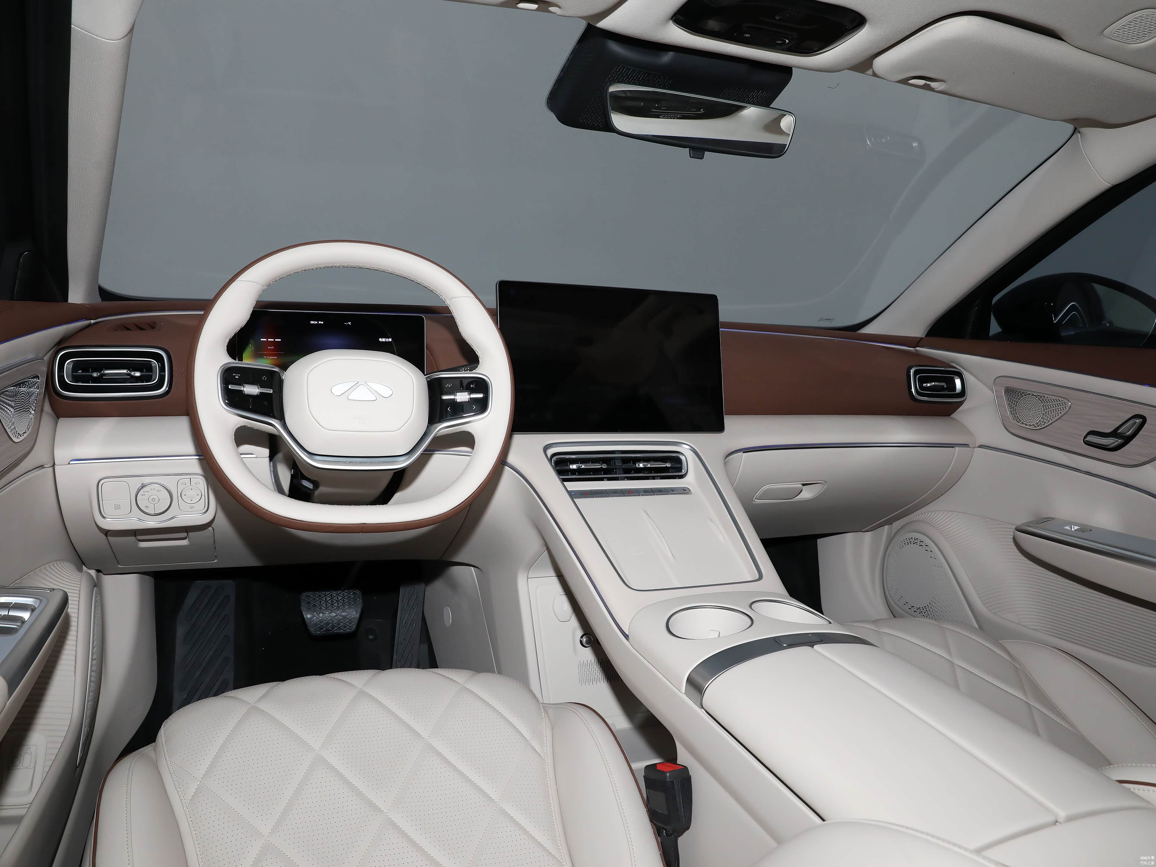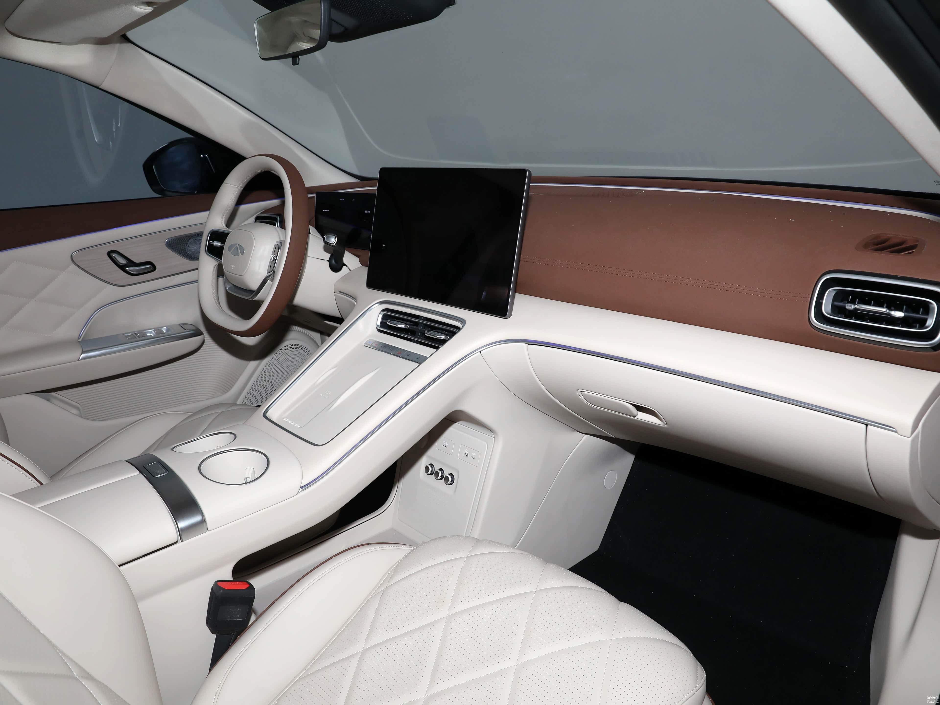 内饰配置体现其旗舰定位,双辐平底方向盘配合怀挡式换挡机构,15.6英寸中控屏幕为主交互载体。座舱搭载灵犀智舱2.0系统,内置高通骁龙8255芯片。其余配置包括华为HiCar手机互联、分段全景天幕、无线充电面板、23单元伯牙之声音响系统、后排出风口与电动尾门等舒适及便利性设施。