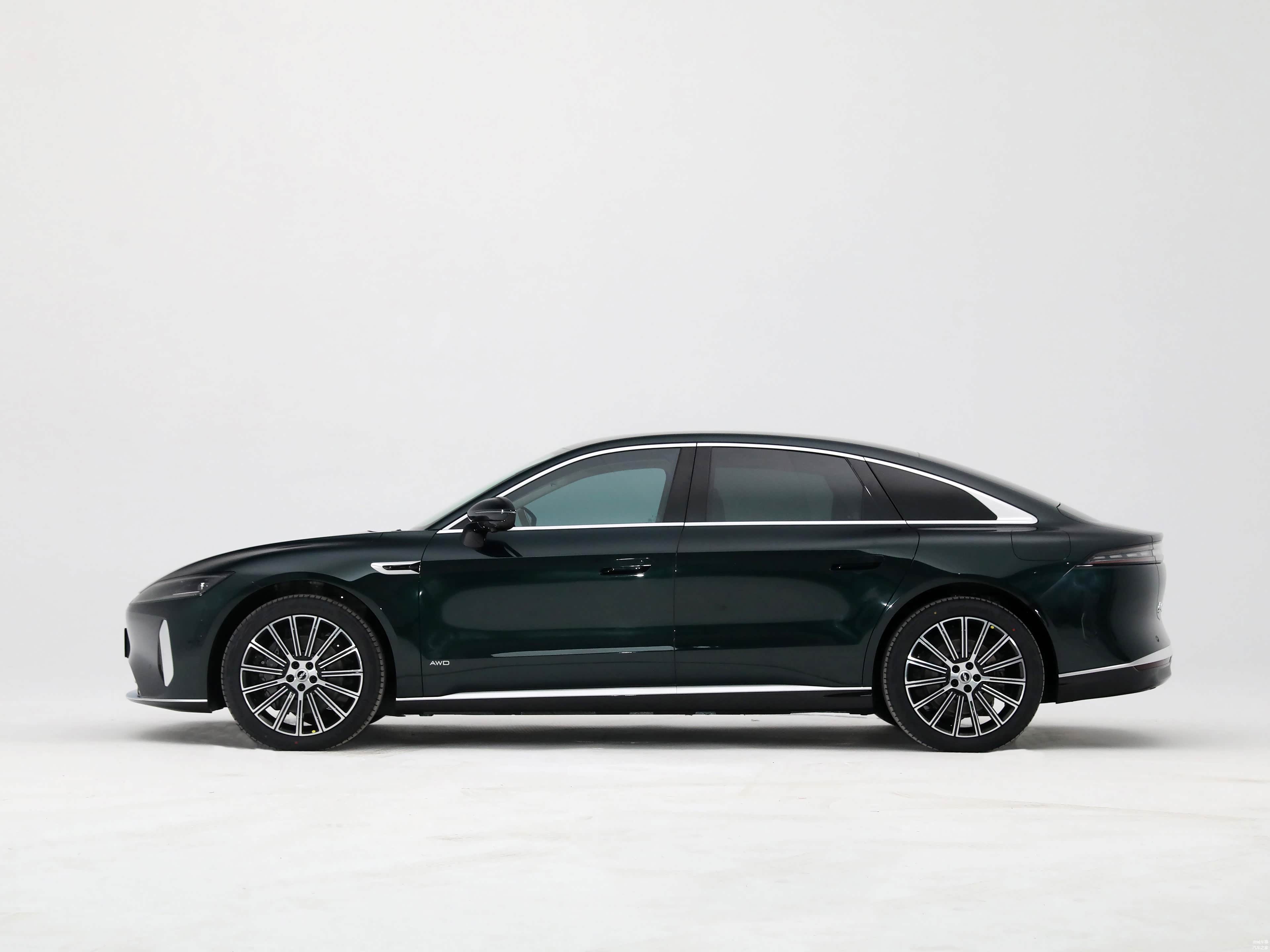 车侧设计通过半隐藏式门把手降低风阻影响,实拍车型匹配了20英寸轮毂及红色制动卡钳。后排配置隐私玻璃,车尾则以贯穿式尾灯与电动后扰流板形成呼应。车身三维尺寸为长5018mm、宽1965mm、高1500mm,轴距达到3000mm,符合中大型轿车空间设定。