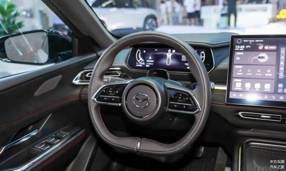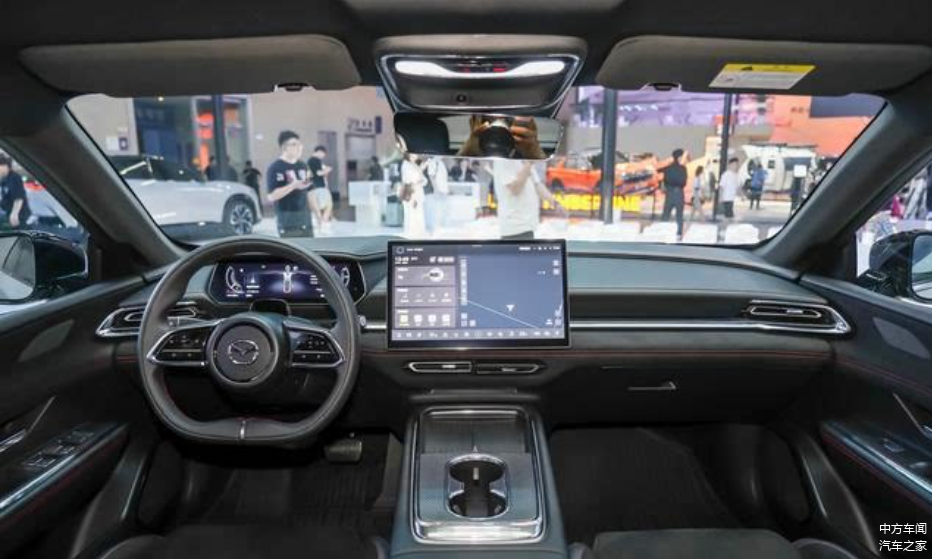 2025款马自达EZ-6运动版的内饰同样延续了老款车型的布局方案,但在细节上进行了优化。中控台区域搭载了双幅式平底方向盘(提供方向盘加热)、10.1英寸液晶仪表、50英寸高清AR-HUD抬头显示系统(智尊版专属)和14.6英寸悬浮式中控屏,科技感十足。电子怀挡换挡机构的使用,让操作更加便捷。座舱内部增加的红色缝线与黑化INS纹理材质,进一步提升了车内的运动氛围感。