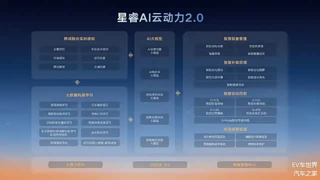 星睿AI云动力2.0包含智慧能量管理、智慧健康管理、智慧补能管理、智慧运动控制四大AI功能,实现了节能、性能、安全等全维度的升级。其中智慧能量管理可通过获取导航路线、平均速度、出行时间、拥堵状况、信号灯、限速等多维数据,瞬时发送指令调节能量分配,实现能量最优组合,节能水平提升5%。