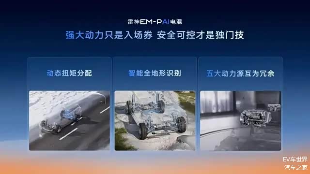 除了出色的加速成绩以外,雷神EM-P AI电混的三电机四驱构型还可结合星睿AI云动力2.0的智能全地形识别功能,自动识别车外的环境、轮胎滑移率、车身姿态和用户意图等,动态分配四轮扭矩。在遇到冰雪等湿滑的路面时,AI可以在2毫秒内完成扭矩的调节;当识别到车身横向摆动时,AI可以对后轮双电机的扭矩方向和大小精准调节,快速抑制横摆,甚至可以做到全场景的爆胎稳定控制。