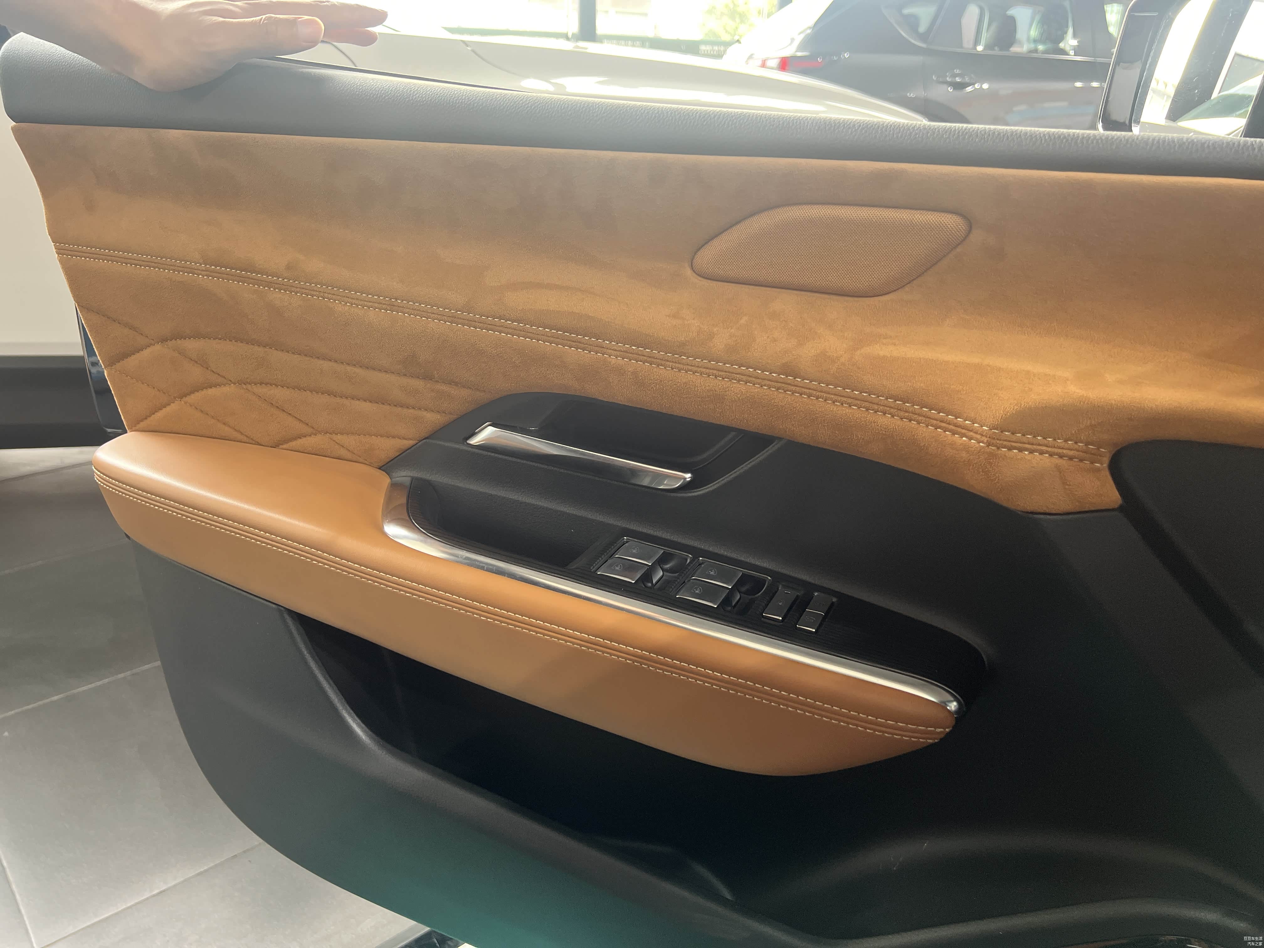 侧门板采用的是仿麂皮的内饰材料,看起来很上档次。双色的内饰设计师非常养眼的,法式双缝线的细节拉满。