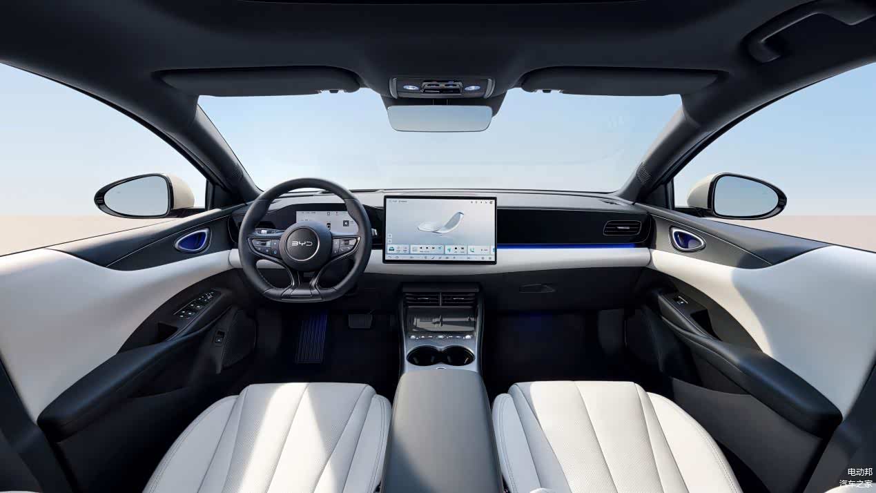 尾部是更为熟悉的海洋网设计,贯穿式波浪尾灯内部采用双L型LED灯带,与前脸形成设计对应,点亮后呈现流水动态效果,搭配可发光的BYD品牌LOGO,夜间辨识度极高。后包围扩散器造型与上翘的小鸭尾设计,展示出更为运动的设计风格。