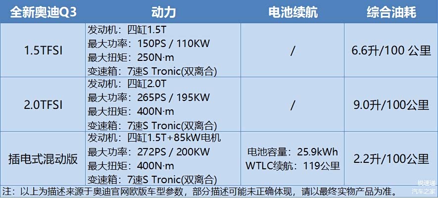 动力性能:全新一代Q3目前公布了三种动力版本,1.5T轻混版本,2.0T quattro版、e-hybrid插电式混合动力版。
