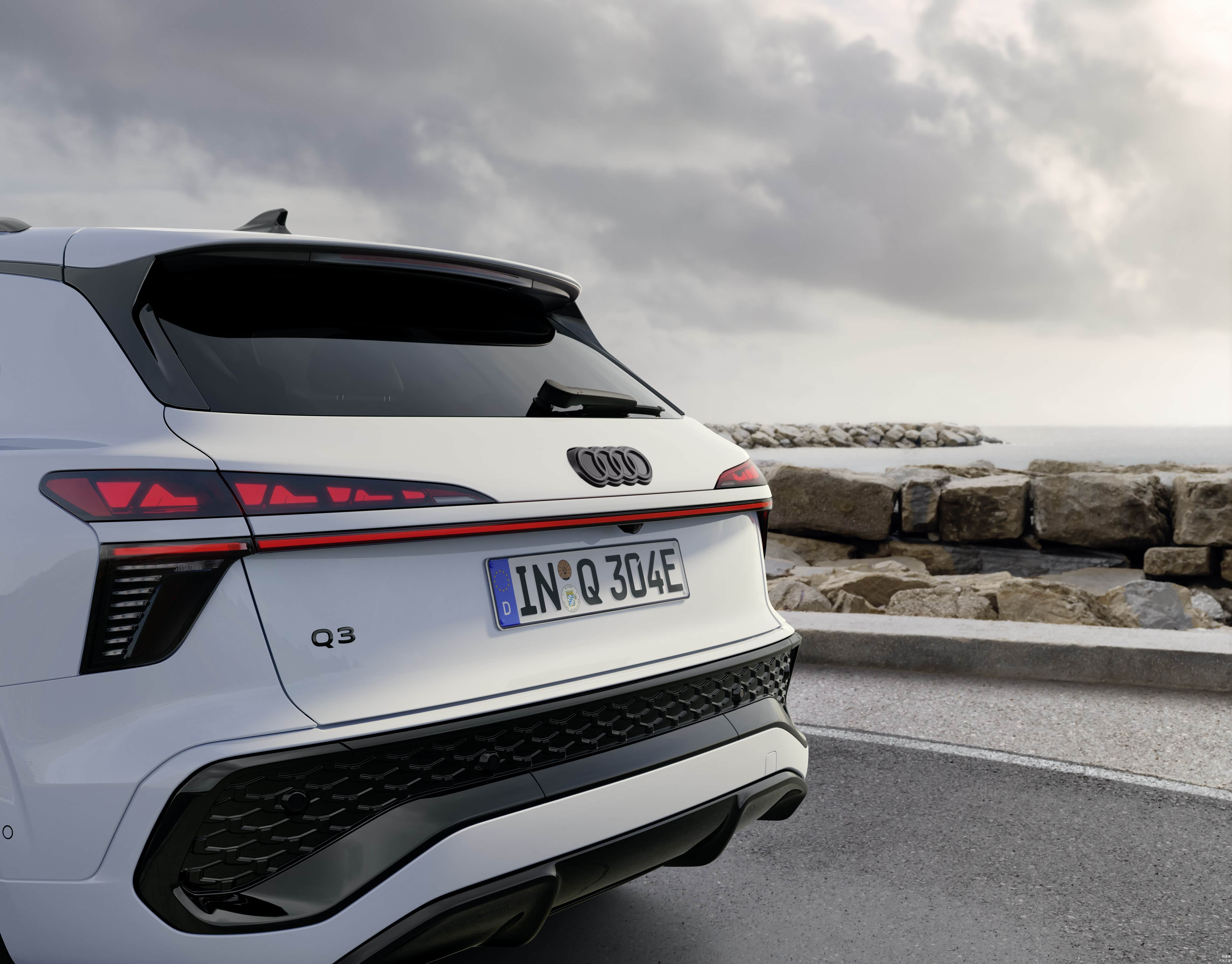 外观设计:全新一代奥迪Q3将标志性的八边形进气格栅设计为上宽下窄的蜂窝状风格,搭配发光四环LOGO和数字矩阵LED大灯(由25,600个微元件组成,每个微元件大约仅为头发丝厚度一半的大小,这种微元件的使用可提升夜间雨雪天气条件下道路上的视觉对比度),贯穿式OLED尾灯搭配自发光的四环LOGO,尾部层次感更强,灯组由36个独立区块组成,可动态显示警示信息此外与数字 OLED 尾灯配合可实现酷炫的动态/迎宾灯效。此外新车提供多种个性化选项,包括11种车身颜色,新增哑光专属色“苍原棕”,标配黑化窗框、行李架及运动套件,此外,与上一代Q3相比,新一代在空气动力学和整体车辆声学舒适度性能方面有显著改善,风阻系数降低至 0.30 cd,并优化了密封绝缘橡胶并提供前侧窗隔音玻璃提高车内静谧性。