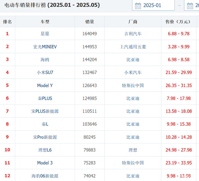 10万预算,想要买新能源汽车,有哪些值得推荐呢?根据2025年1-5月销量来看,在10万区间销量比较高的新能源汽车有秦PLUS、秦L、 宋Pro新能源(图片 | 参数 | 询价)、海豹06新能源等车型。