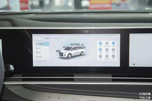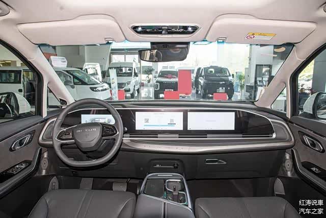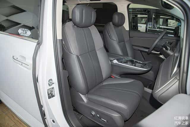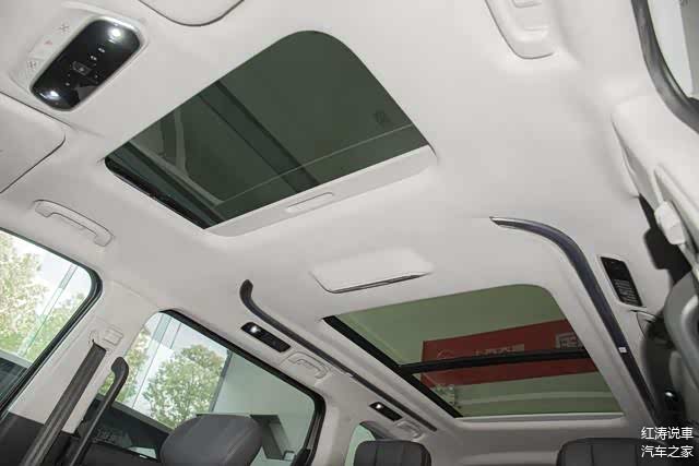 车内采用2+2+3的7座布局,第一排和第二排座椅均是电动调节,具有座椅加热、通风、按摩功能,第二排两个零重力座椅还带有电动腿托和腰部支撑,头顶分段式天窗保障了良好的通透性。