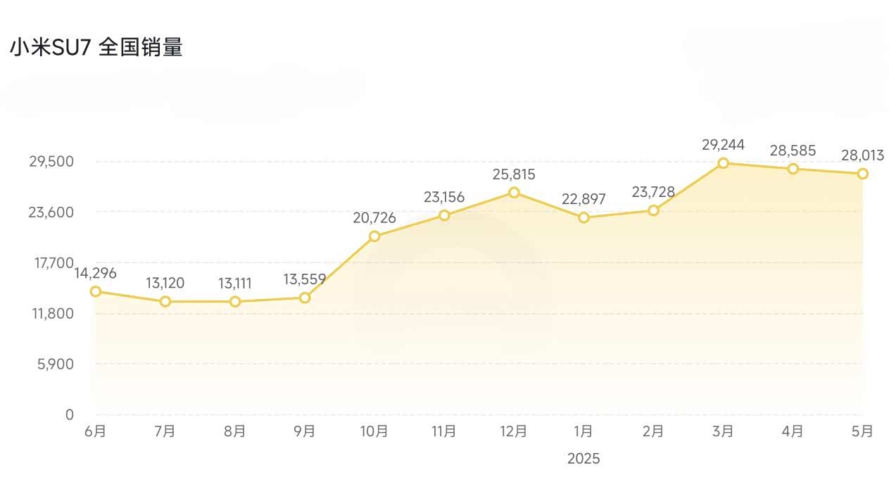 最近一年(2024年6月-2025年5月),小米SU7和Model 3累计销量分别为25.6万辆19.9万辆,前者较后者高出28%。其中,小米SU7有8个月销量都超过了Model 3。