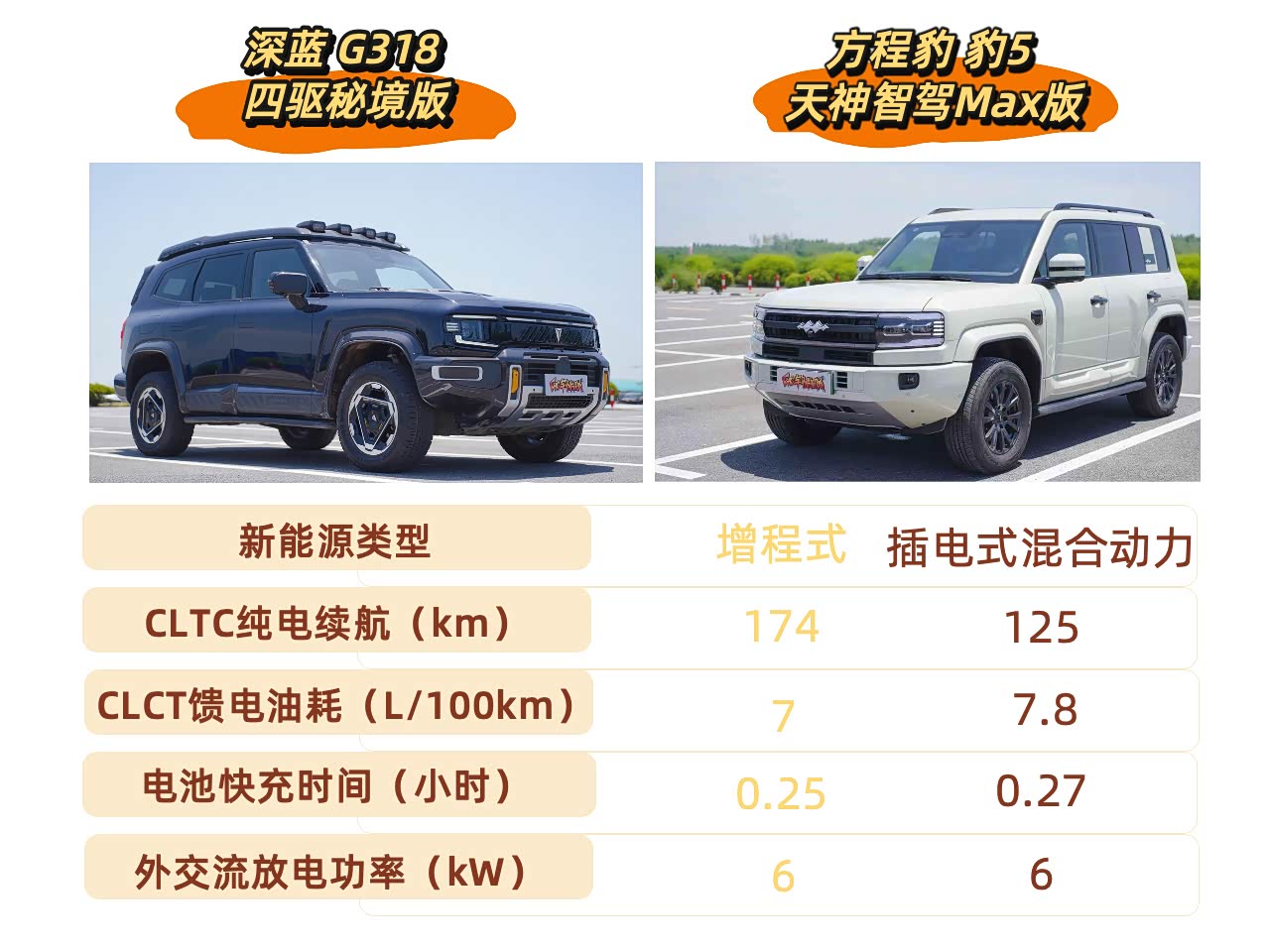 本次实拍车的配置为深蓝G318 2025款无忧穿越版四驱秘境版和豹5 2025款天神智驾Max版,指导价分别为22.99万元和23.98万元,下文中两车的功能表现都基于以上两款配置描述。
