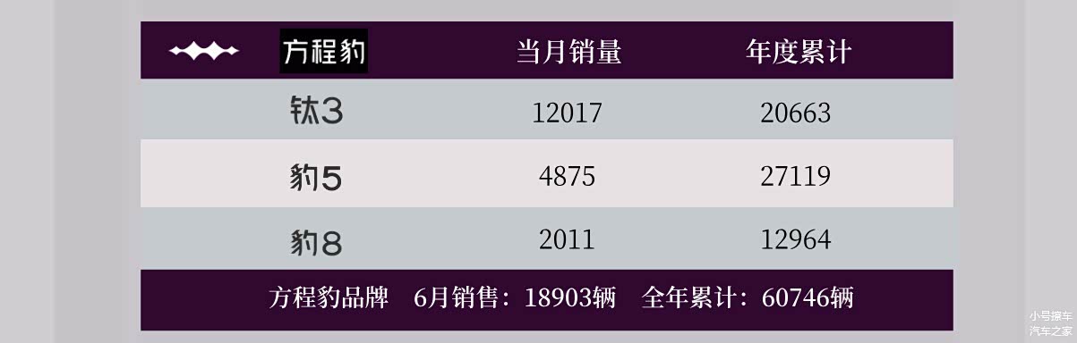方程豹品牌6月份销量18903辆,起势非常猛,环比增长50.1%,同比增长605.3%,年度累计销量60746辆;其中钛3在6月份销量12017辆,年度累计销量20663辆;豹5在6月份销量4875辆,年度累计销量27119辆;豹8在6月份销量2011辆,年度累计销量12964辆。