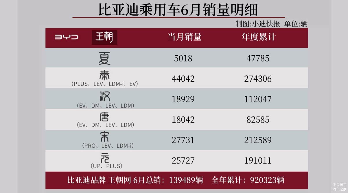 具体到车型方面,王朝网6月份销量139489辆,全年累计920323辆;其中比亚迪夏6月份销量5018辆,未能在延续破万的强势表现,年度累计47785辆;秦家族6月份销量44042辆,年度累计274306辆;汉家族6月份销量18929辆,年度累计112047辆;唐家族6月份销量18042辆,年度累计82585辆;宋年度6月份销量27731辆,年度累计212589辆;元家族销量25727辆,年度累计销量191011辆。