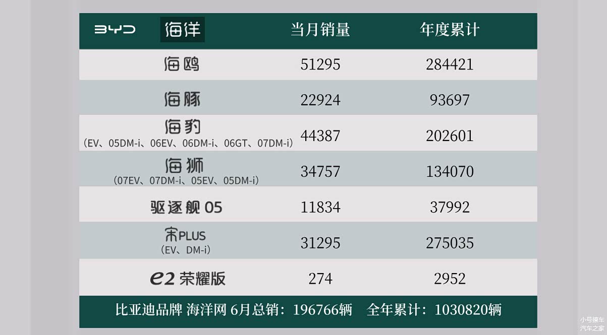 海洋网6月份销量196766辆,年度累计1030820辆;海鸥家族6月份销量51295辆,年度累计销量284421辆;海豚6月份销量22924辆,年度累计销量93697辆;海豹家族6月份销量44387辆,年度累计202601辆;海狮家族6月份销量34757辆,年度累计销量134070辆; 驱逐舰05(图片 | 参数 | 询价)在6月份的销量为11834辆,年度累计销量37992辆;宋PLUS家族6月份销量31295辆,年度累计销量275035辆;e2荣耀版6月份销量274辆,年度累计2952辆。