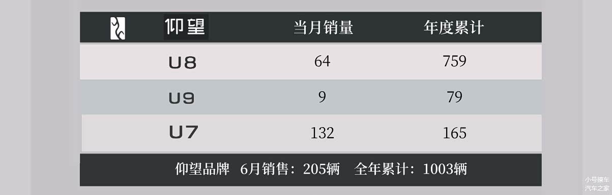 仰望品牌6月份销量205辆,年度累计销量1003辆;其中仰望U8在6月份卖出64辆,年度累计759辆;仰望U9在6月份卖出9辆;年度累计79辆;仰望U7在6月份卖出132辆,年度累计165辆。不要看数字不算大,从地位来看,其实这样的销量也是能够接受的,这个级别的市场容量原本就不大。
