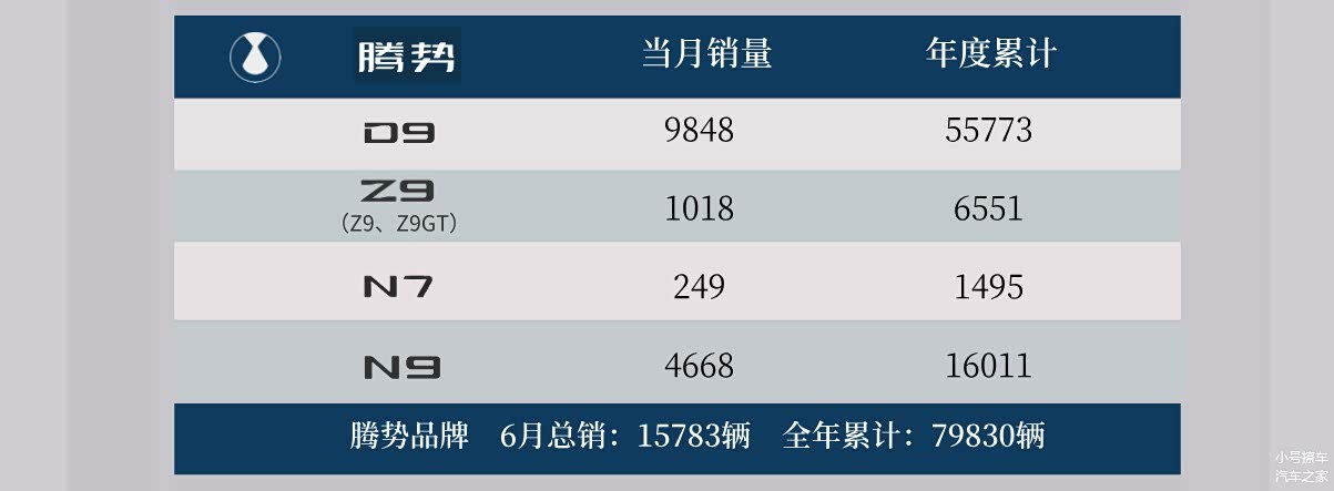 腾势品牌6月份总销量15783辆,年度累计销量79830辆;腾势D9在6月份销量9848辆,年度累计55773辆;腾势Z9家族6月份销量1018辆,年度累计销量6551辆;腾势N7在6月份销量249辆,年度累计销量1495辆;腾势N9在6月份销量4668辆,年度累计销量16011辆。