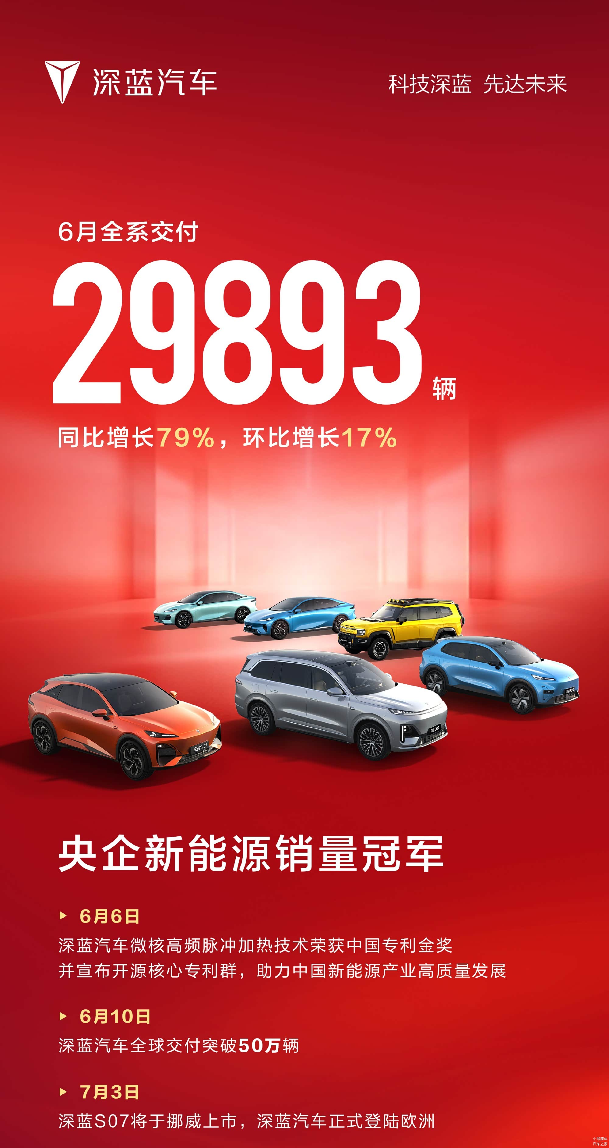 深蓝汽车排名第六,6月份全系交付29893辆,目前累计交付已经超过50万辆,深蓝S09把大型新能源SUV的起售价拉低到了23.99万元起,着实吸引了不少订单。