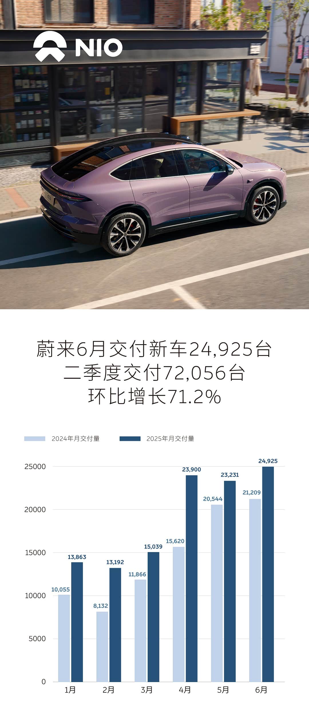 接下来是蔚来汽车,6月份交付24925辆,同比增长17.5%,二季度累计交付72056辆,同比增长25.6%。6月份蔚来品牌交付新车14593台;乐道品牌交付新车6400台;firefly萤火虫品牌交付新车3932台。接下来,蔚来还准备了乐道L90以及全新ES8等车型,销量或许会有进一步的提升。