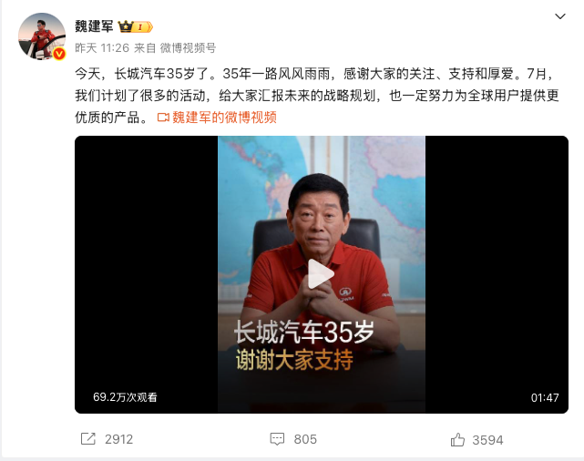 继2025款 欧拉好猫(图片 | 参数 | 询价)家族上市之后,长城汽车董事长魏建军发布视频,庆祝长城汽车成立35周年。魏建军透露,长城汽车在7月份会举办多场活动,其中包含未来五年的规划、技术路线、市场路线、品牌发展路线等等,而且还会发布“极具创新的新平台”。