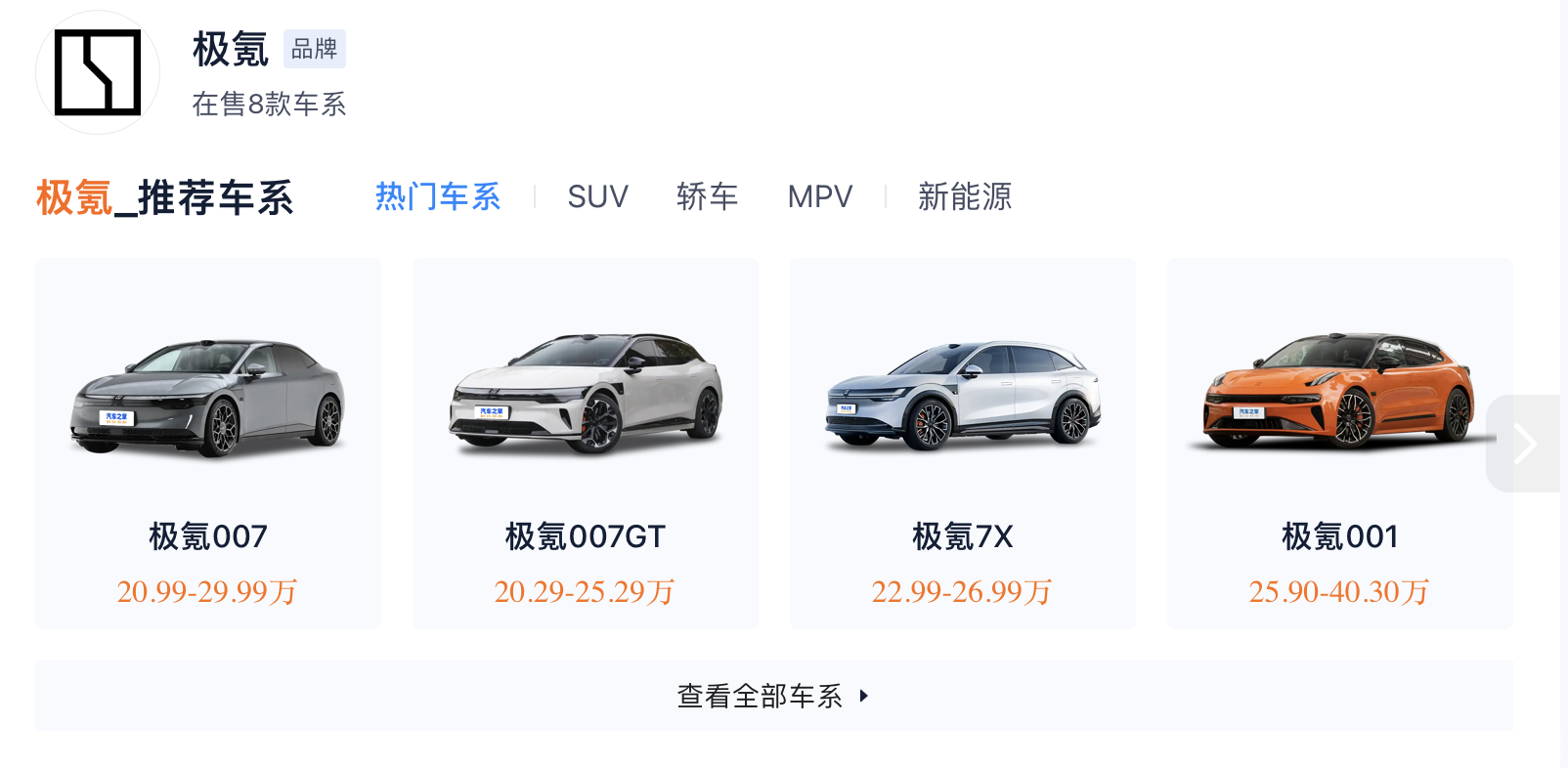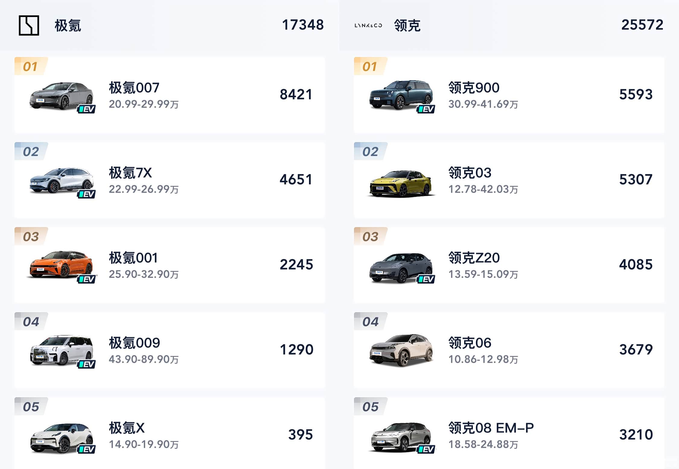值得一提的是,极氪与领克合并后,其领克品牌主攻20万元级混动市场,但极氪入门车型极氪X价格,目前已经下探至18.98万元,导致双品牌在20万-25万元价格区间互相抢客。这种“左右手互搏”的现象,直接稀释了整体战斗力。