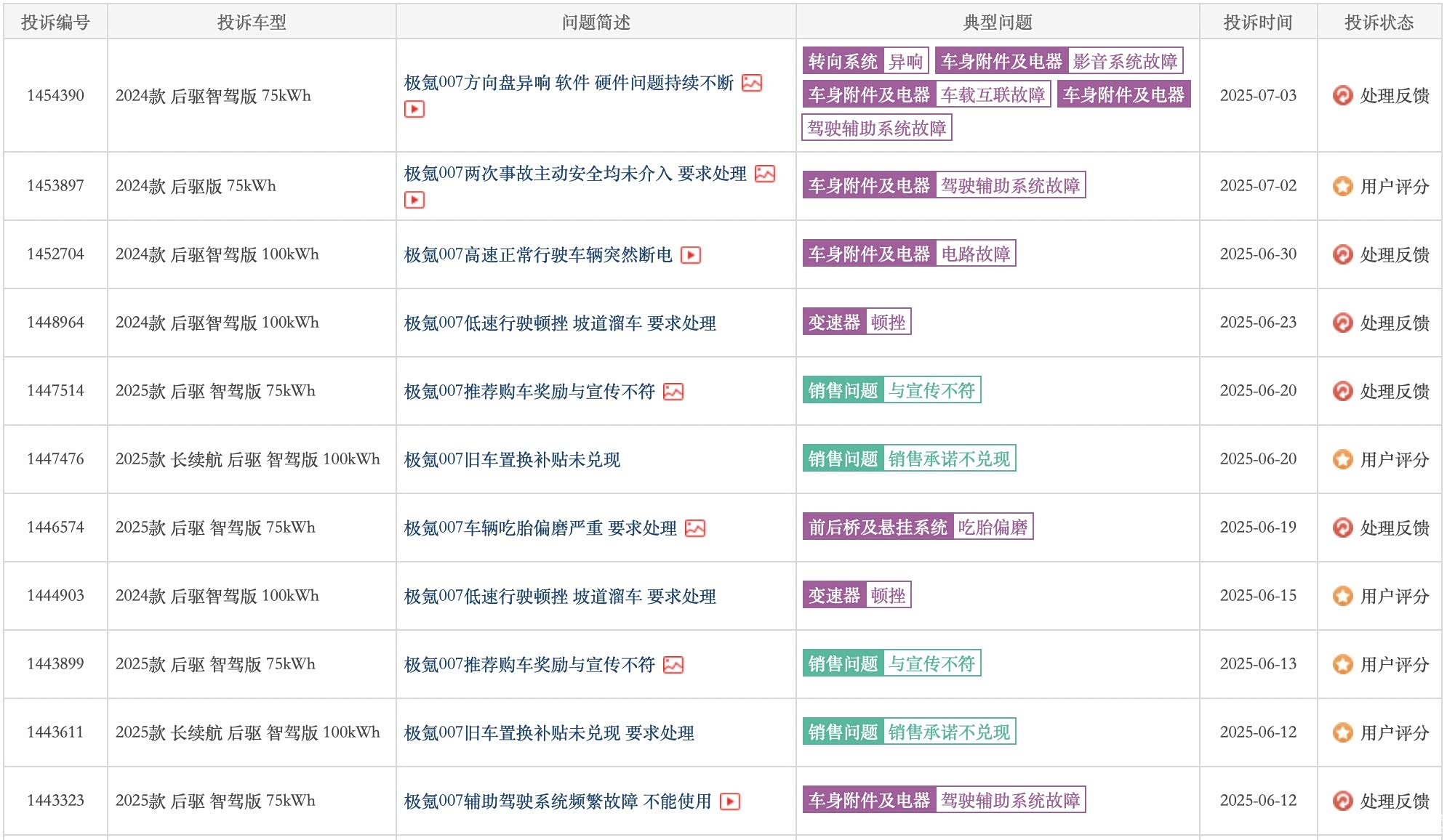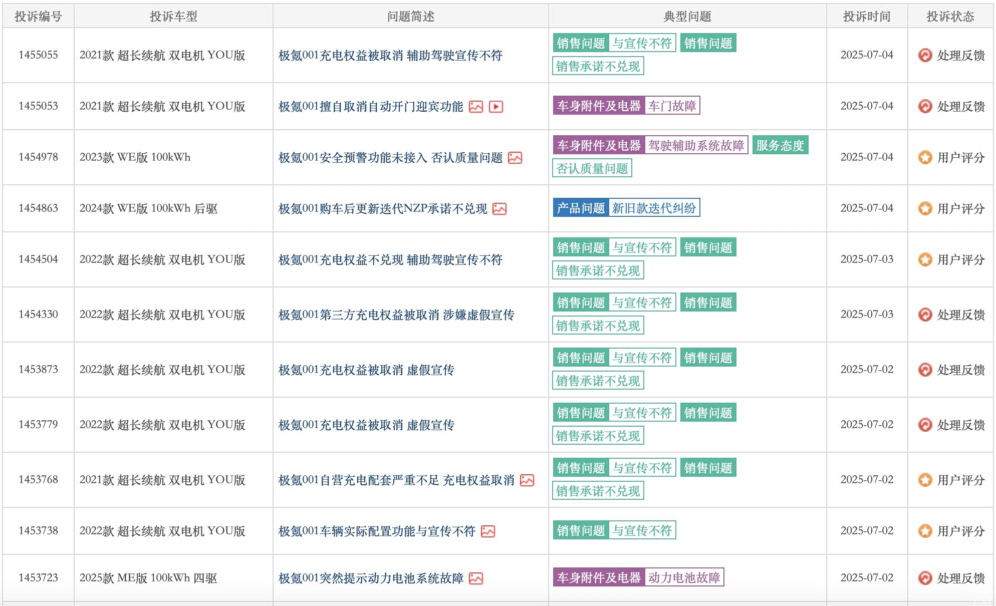 从车质网的相关投诉来看,除了软件体验不足,直接影响用户复购意愿外;消费者对于极氪品牌的承诺不兑现、宣传不符、价格变动以及销售问题车等典型问题,并未能得到妥善处理,对品牌力产生了不利的影响。