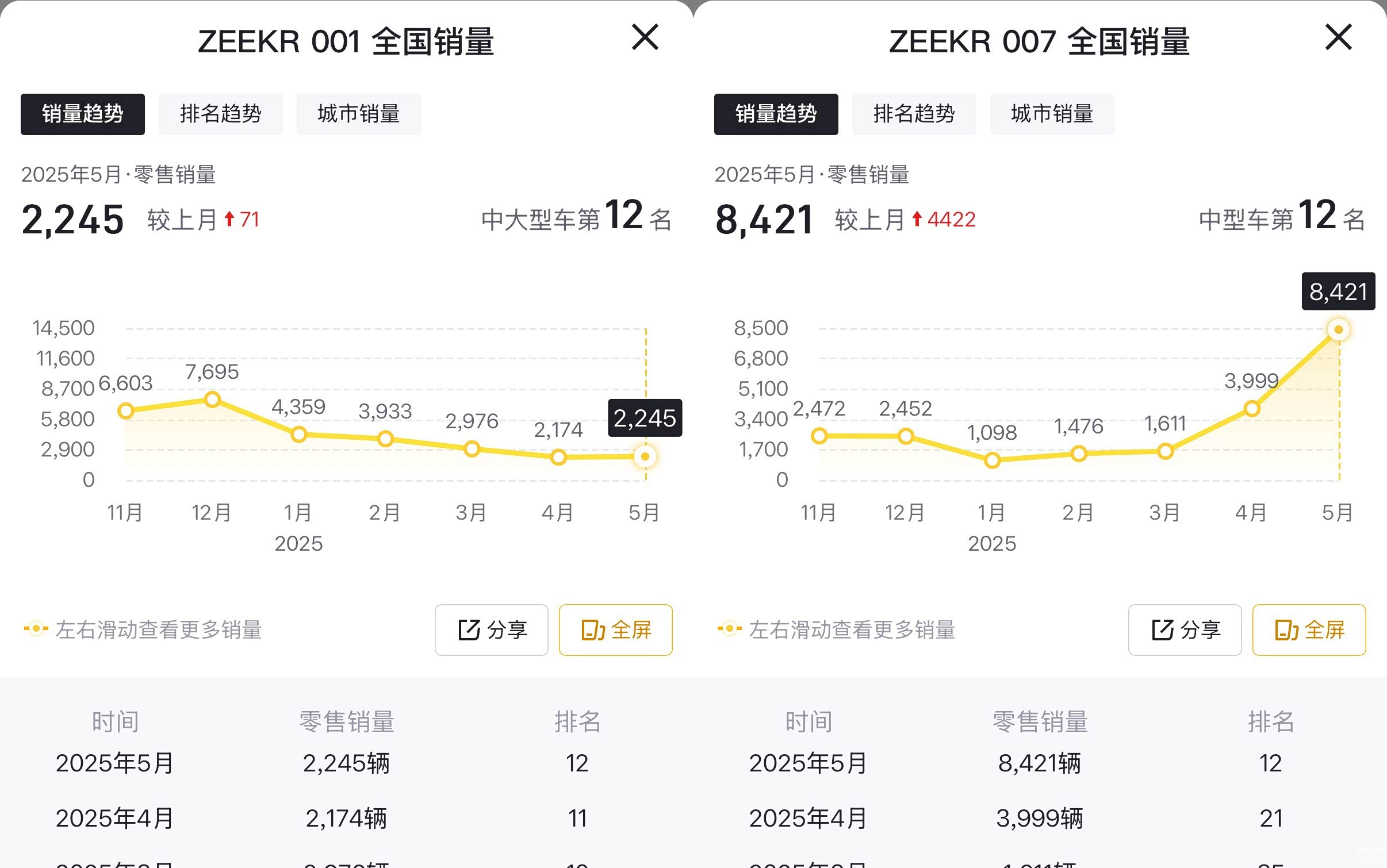 从销量数据看,极氪007系列(含基础版和GT版本)2025年5月销量为8,421辆,而极氪001同月份仅有2,245辆。但需注意,极氪007 GT版本自2025年4月上市后,单月交付量已突破8,000辆,成为品牌主力车型。