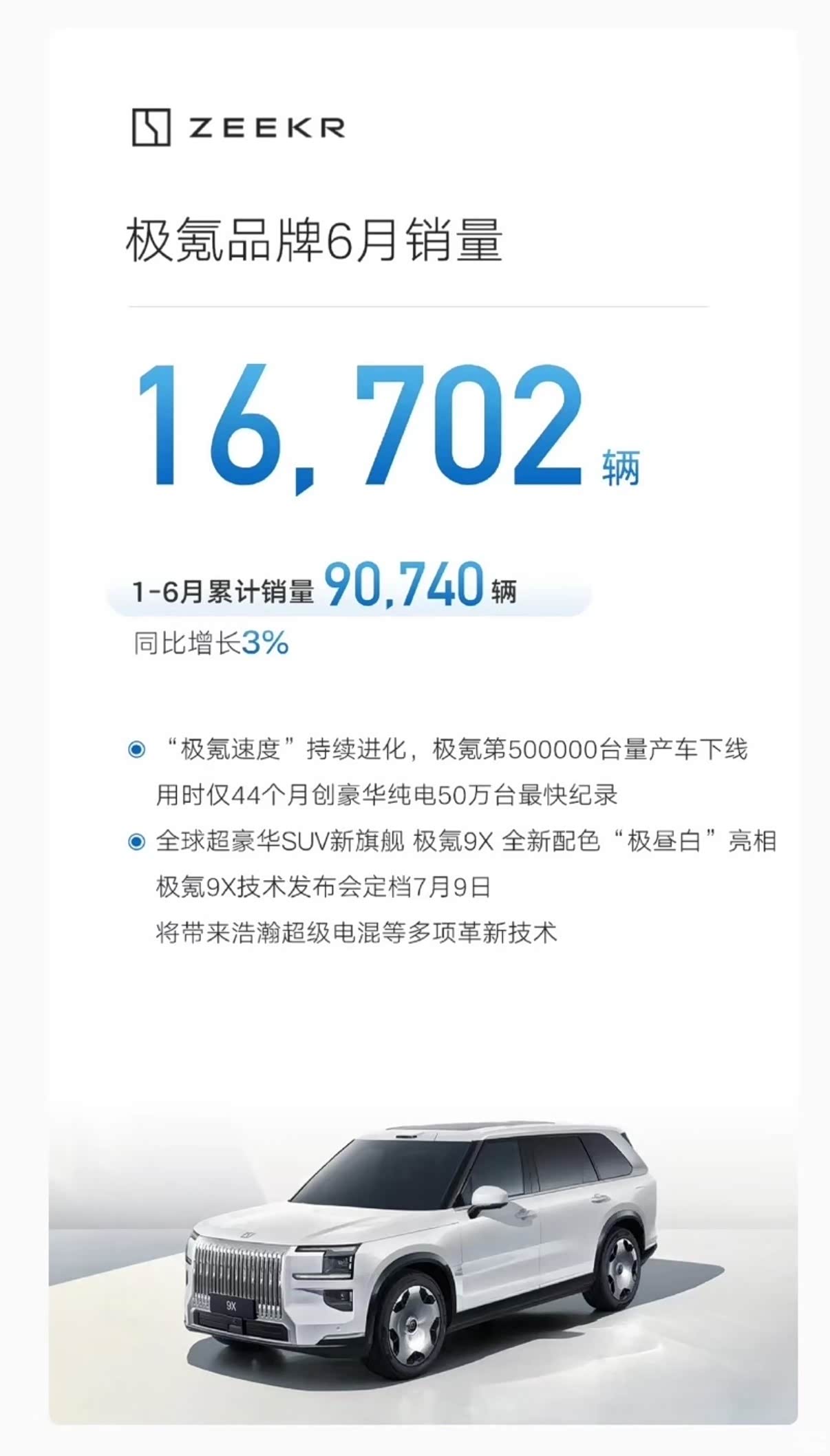 6月,极氪品牌销量为16,702辆,同比下降16.9%;2025年上半年,极氪累计销量达90,740辆,同比增长3.26%,但较2024年增速显著暴跌(2024年增速为106.1%)。