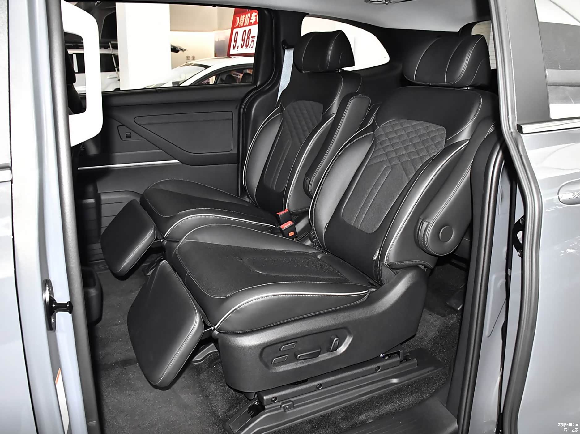 进入第二排,侧滑门开启方式只有两款旗舰版支持双侧电动侧滑门,而入门版两边都是手动开启;尊贵版支持右侧电动,左侧手动开启。第二排是两个零重力独立座椅,设置有扶手、出风口,除了入门版,其它车型都还配备了小桌板;除了入门版和次入门版,第二排座椅都支持电动调节、加热、通风功能。