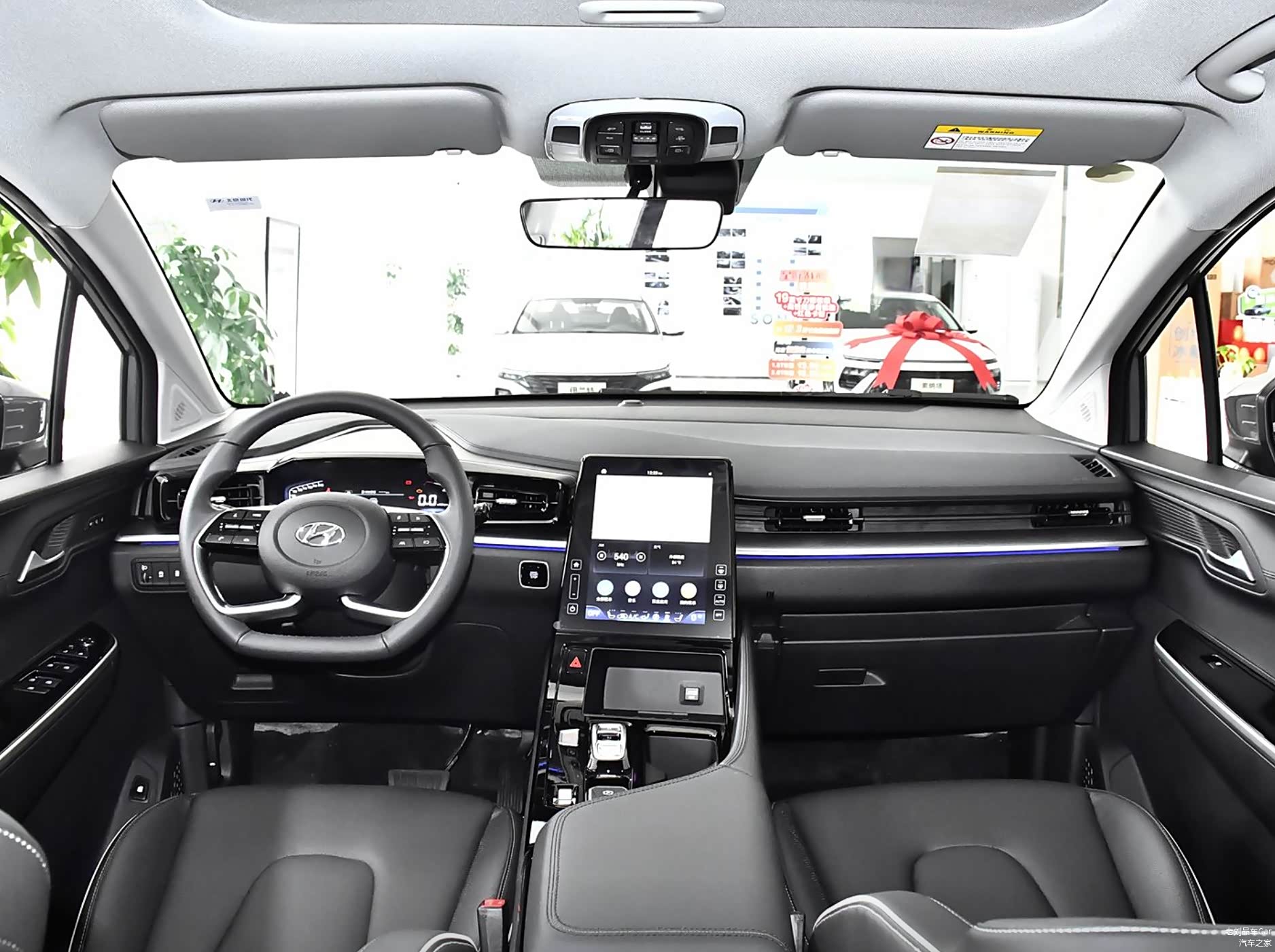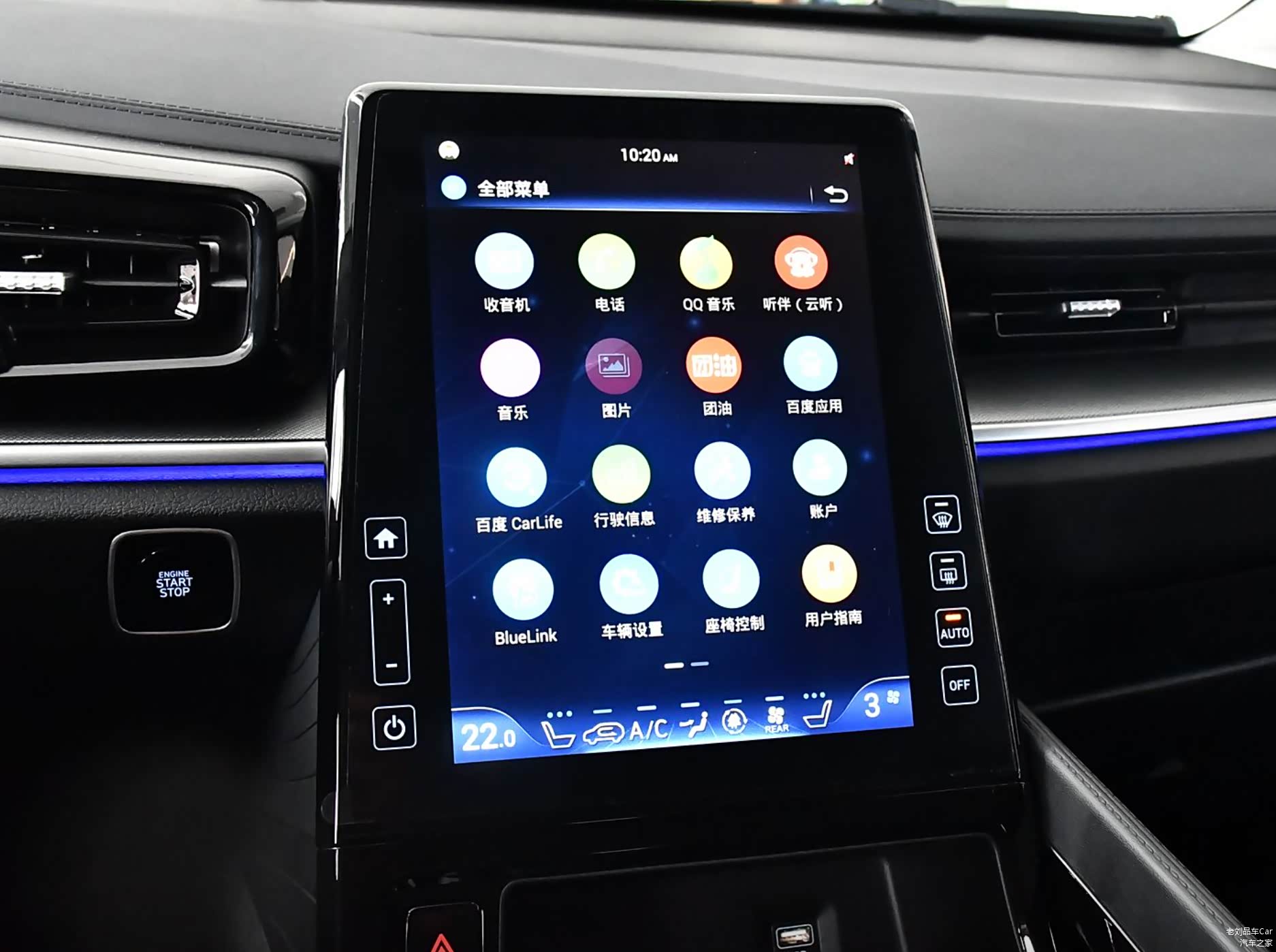 旁边两个杯架,前面是除了入门版和次入门版之外,其他车型标配的手机无线充电板,下面是一个很大的储物格,里面有两个USB接口。中控台上一块全液晶仪表盘和一块10.4英寸的中控竖屏,显得很有科技感。车机交互方面,全系都支持CararLife手机互联和手机APP远程控制。除了入门版,其他车型都配备了“Bluelink”车载智能系统,支持4G车联网、语音识别控制,但不支持OTA升级,车机功能很基础。智能辅助驾驶方面,全系支持倒车影像、定速巡航,除了入门版,搭载“Hyundai Smart Sense”辅助驾驶操作系统,支持前车驶离提醒,强化了日常用车的安全性。其中顶配版支持L2级辅助驾驶、360°全景影像、全速域自适应巡航,提升整个车辆的产品竞争力。