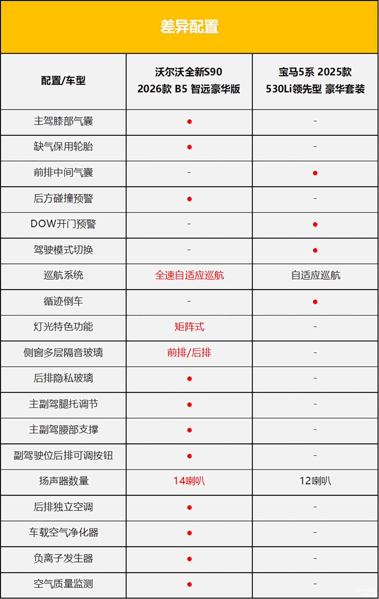 为了更有参考性,我们拿比较走量的车款进行对比,分别是沃尔沃全新S90 2026款 B5 智远豪华版和宝马5系 2025款 530Li领先型 豪华套装。