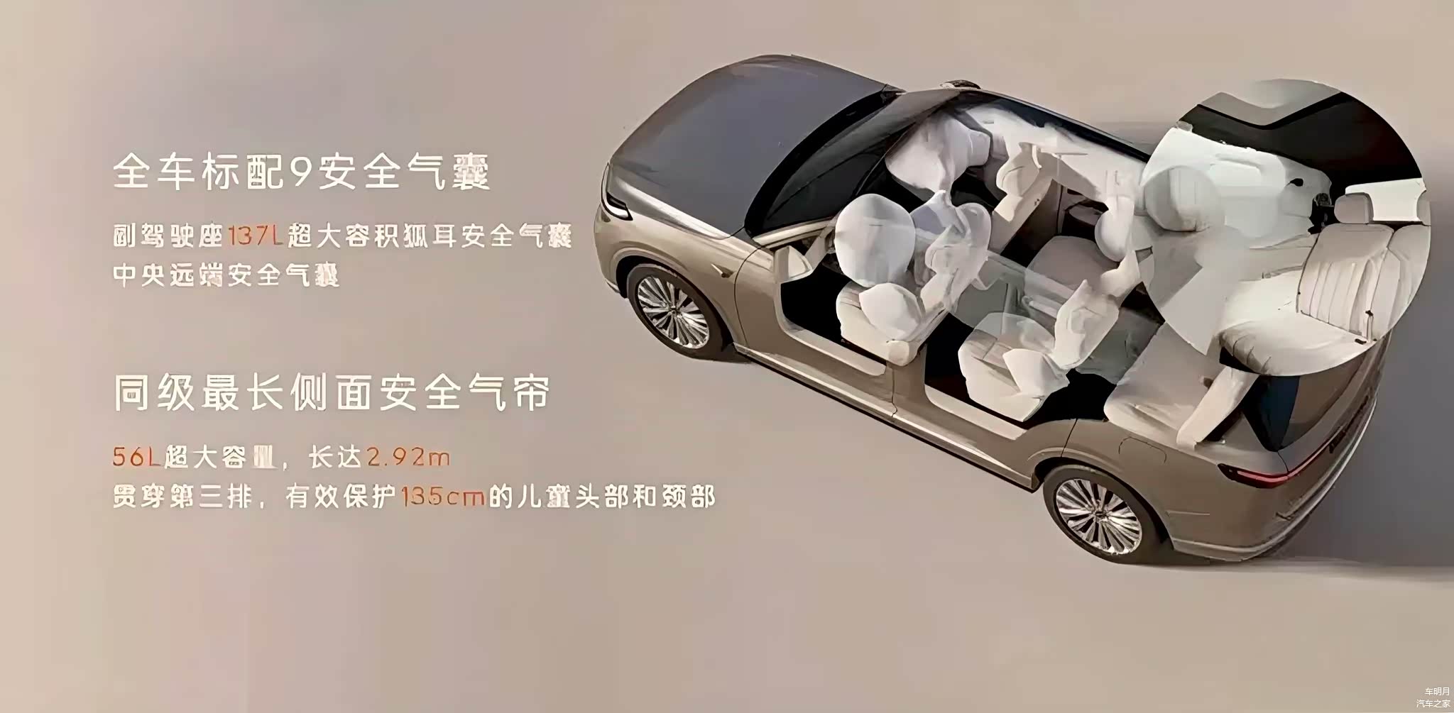 安全性能是乐道L90的重中之重。标配9个安全气囊和2.92m侧气帘,侧气帘延伸至第三排车窗下方,在车辆受到撞击时,能有效保护身高135cm儿童的头部和颈部,为家庭出行提供全方位的安全保障。