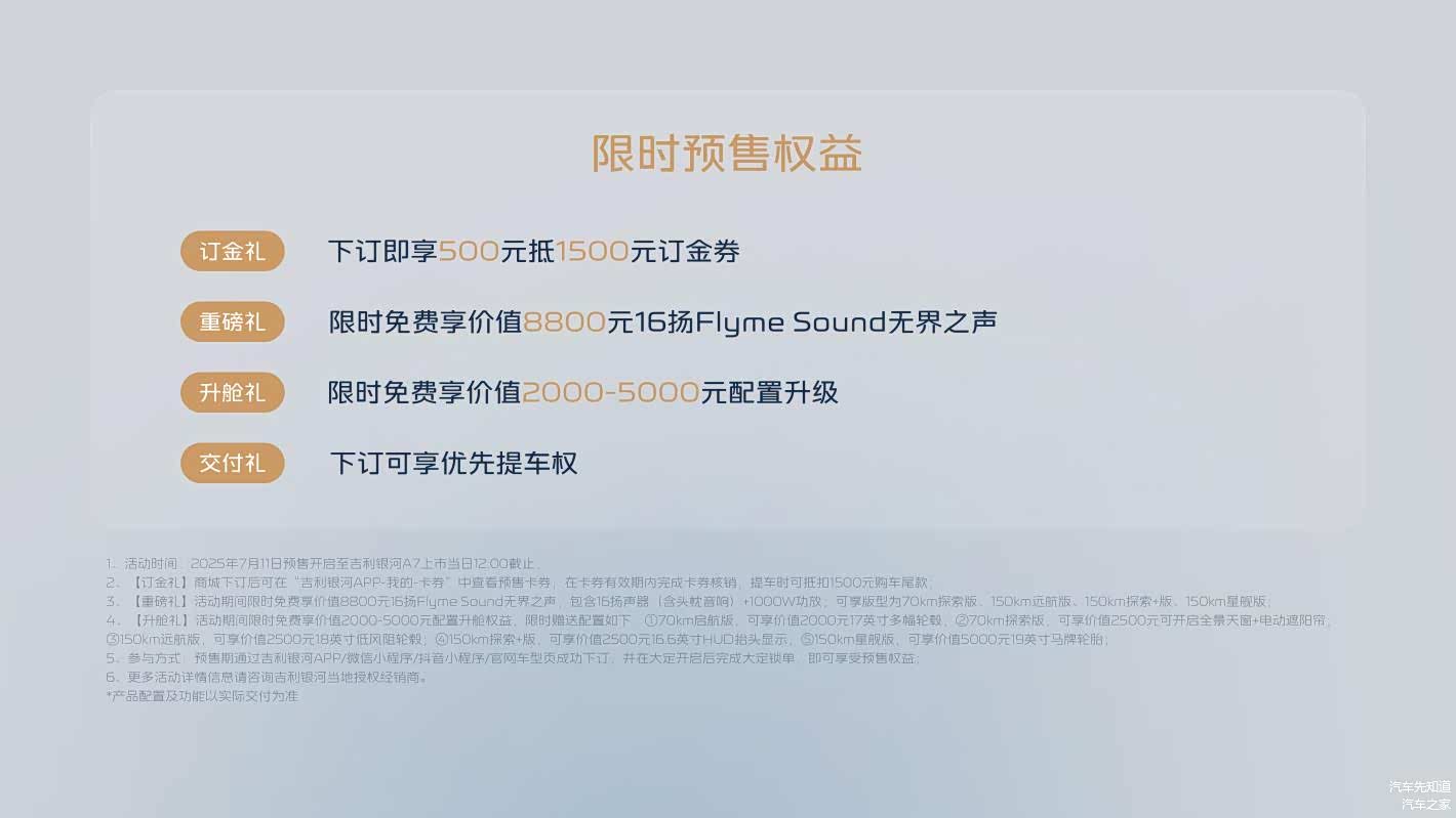 目前,银河A7预售权益包括500抵1500元订金券、限时免费升级2000-5000元配置(如17英寸轮毂、全景天窗遮阳帘等),部分版本还能免费获得价值8800元的16扬声器音响系统。