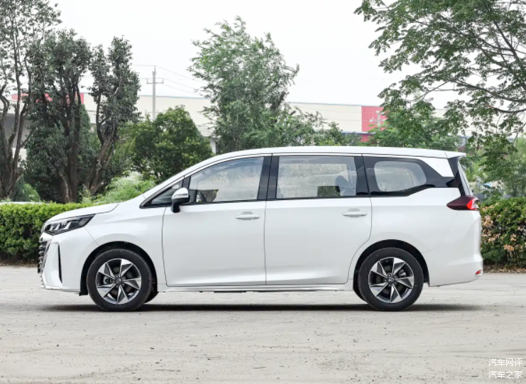 车身侧面线条平直流畅,保证了车内充足的头部和腿部空间。车窗边缘采用镀铬饰条包裹,提升了整车的精致感,17 英寸铝合金轮毂造型简洁大方,搭配厚重的车身,既稳重又不失时尚。车尾部分,竖向排列的尾灯组与前脸设计相呼应,保险杠下方的银色护板增加了几分实用气息,整体造型符合家用 MPV 的沉稳定位。