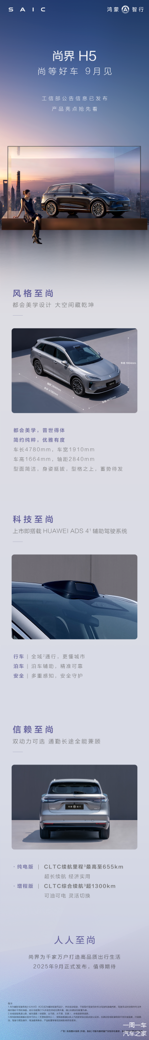 随着工信部新一轮车辆公示信息发布,关于 尚界H5(图片 | 参数 | 询价)的信息逐渐明朗,距离新车正式入局20万级SUV市场又进了一步。据余承东表示,尚界H5将于9月上市,一场前所未有的“价值淘汰赛”即将上演。