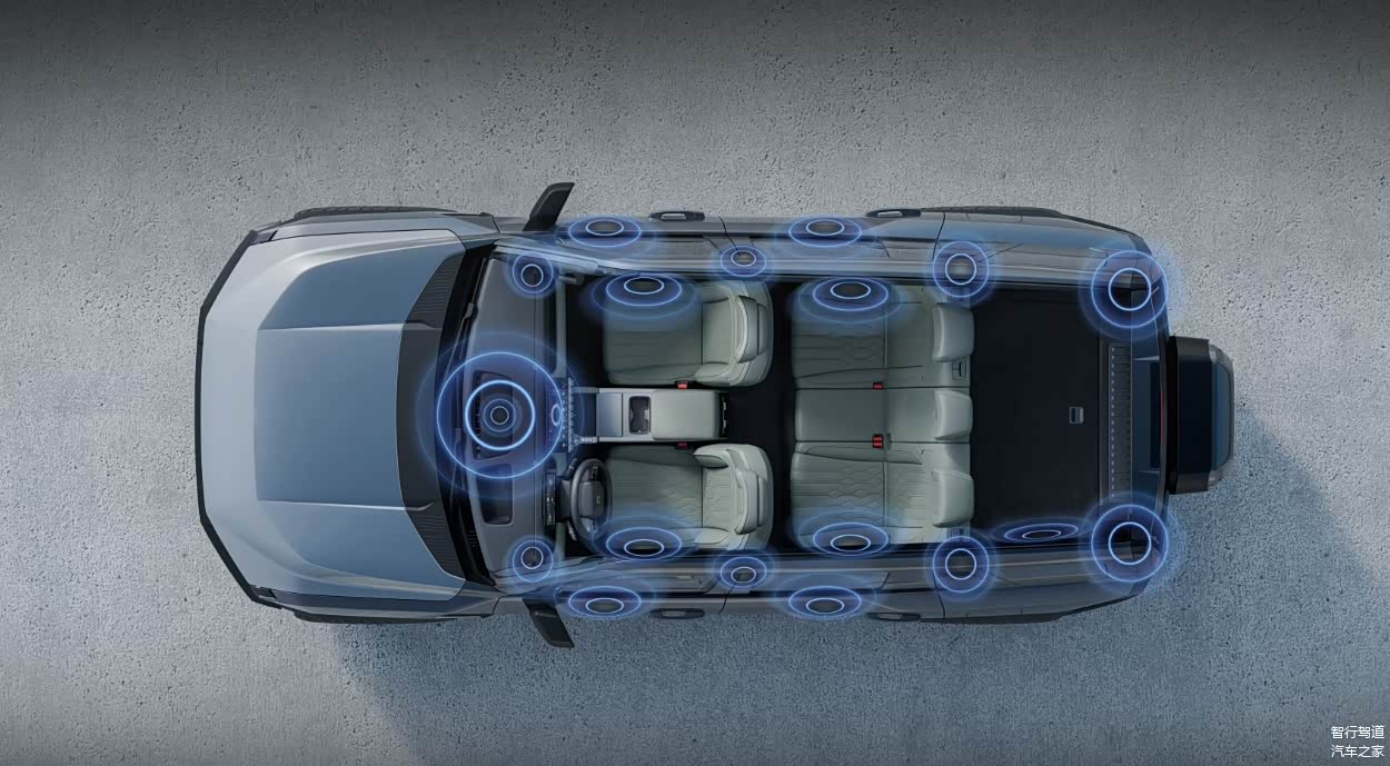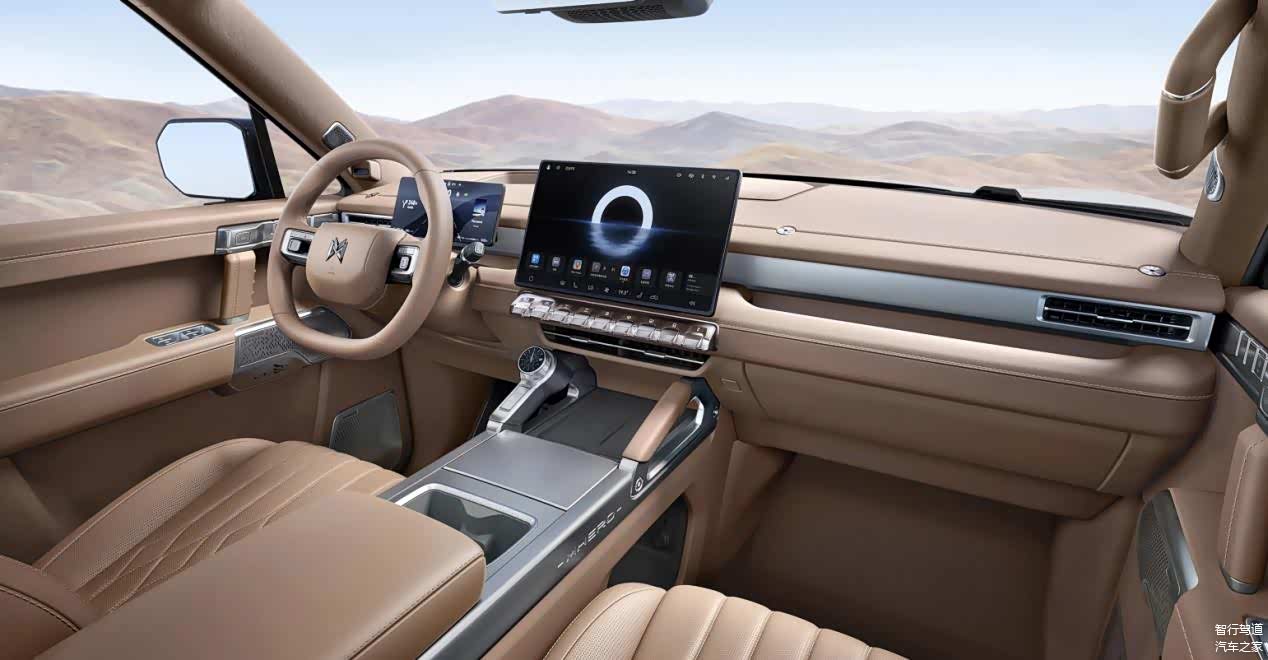 内饰方面,猛士M817整体采用对称布局,仪表台采用镁铝合金骨架包覆软质材料。前排座椅14向电动调节,带通风、加热、按摩,后排靠背角度可调,放倒后与行李舱形成纯平空间,最大容积2112升。车内布置多处Type-C与USB-A接口,总功率220瓦,支持外放电3.3千瓦。车顶为可开启全景天窗,基本实现玻璃紫外线完全隔绝。