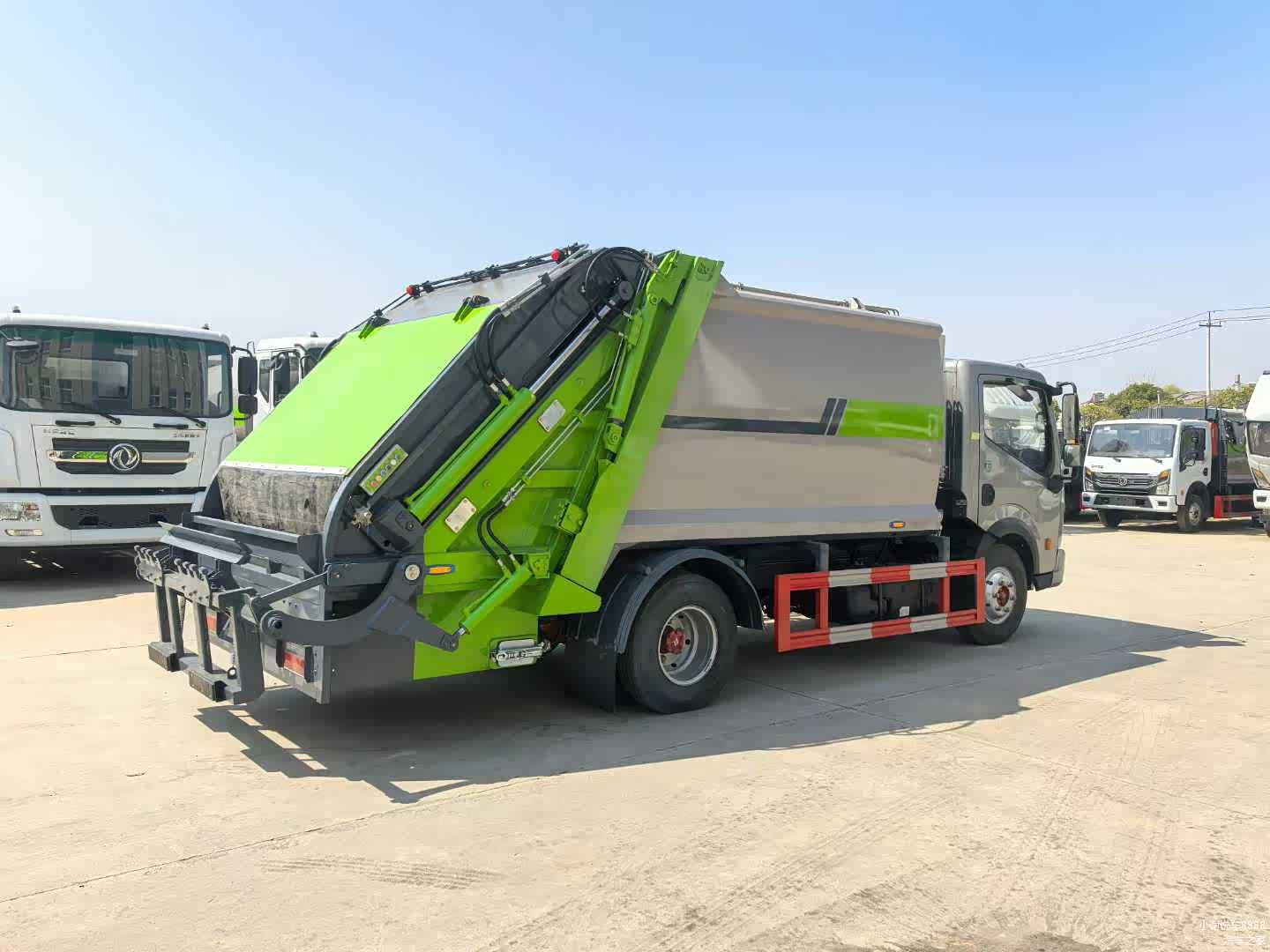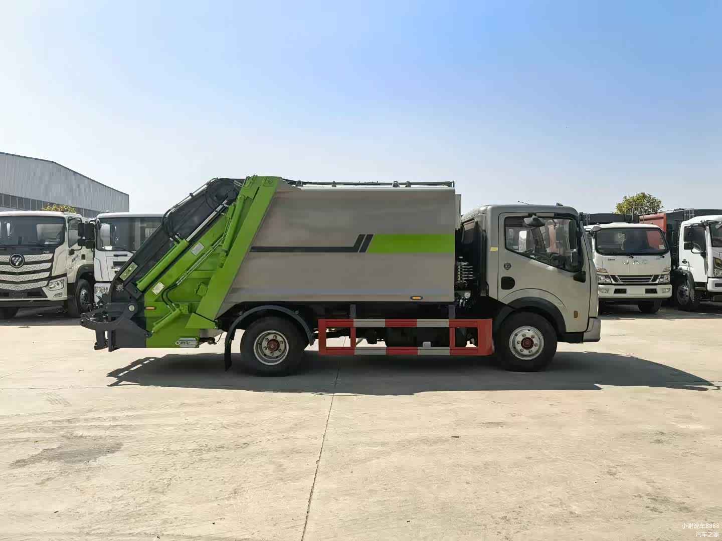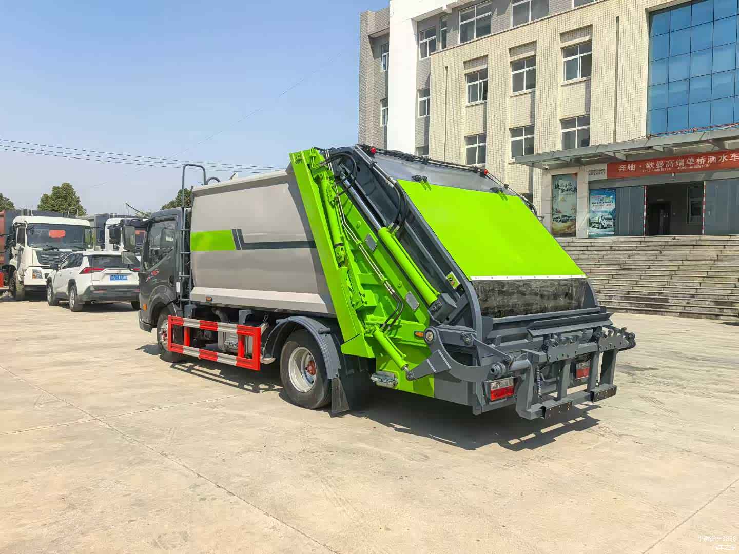 上装配置:弧形箱体,容积8立方,箱体采用Q345锰板,边3mm底4mm,填充器采用Q710高强钢,弧形底板5mm,滑轨8mm,福建山友定制油缸,中梅多路阀,皖液油泵,填装器举升油缸带双向平衡阀,采用湖南长沙CAN总线电控系统,德国伊顿操作面板,日本川户无线遥控器(采用光电开关,带一键操作、手动操作和无线遥控三种控制方式),操作盒共两只(驾驶室内部及后尾部右侧可操作,填充器左侧安装一个急停开关),后填装器标准下部一只污水箱,带防尘盖,其余按公司标准配置制作。