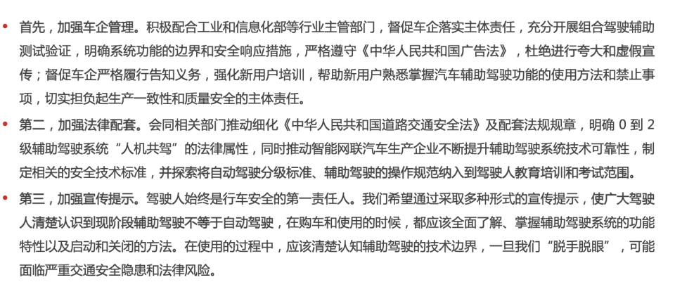 为规范智能驾驶系统管理,公安部将联合有关部门从加强车企管理、加强法律配套以及加强宣传提示三个方面推进工作。以上为全文,这里就不再赘述。